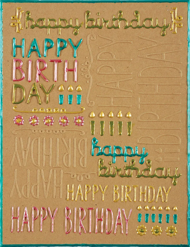 Cut 4 1/4”x5 1/2” of kraft brown cardstock and spritz lightly with water. Place inside the birthday embossing folder. Place the folder on top of the dark gray embossing platform and place the flexible cutting mat on top. Roll the “sandwich” through the Epic tool. Remove the embossed cardstock and glue to the front of the card 1/16” from the bottom and left. Trim the card so there is a 1/16” white border on all sides.