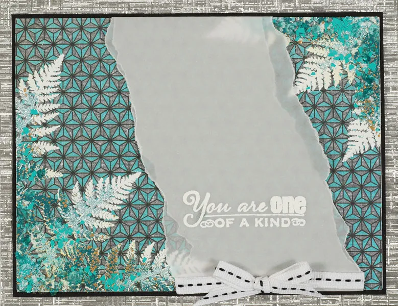 Stamp and emboss “You are one of a kind” in white on a 5 1/2” square of vellum, 1 1/2” from the lower edge. Tear the left and right edges at an angle, keeping the sentiment centered at the bottom. Tear the edges of another 5 1/2” square of vellum, the same as the first. Place the vellum pieces on top of each other and place on your piece, as shown, folding the ends under your piece. Tie a length of ribbon around the vellum, even with the lower edge. Mat your piece on black cardstock with a 1/16” border.