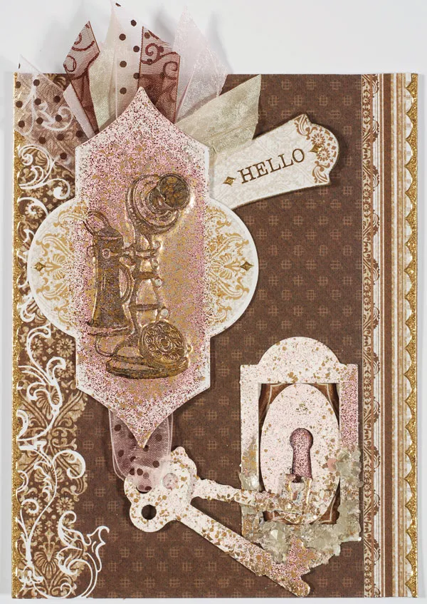 Apply VersaMark™ to the center of a 3”x4 1/2” pointed label die-cut and dust heavily with Aged Rose embossing powder. Heat emboss from underneath. Ink the telephone stamp with brown StazOn®. Heat the embossed area of the die-cut again from above and quickly press the telephone stamp into the warm embossing enamel, creating an impression. Remove the stamp and let the image cool. Foam tape over the key ribbon, 1/4” from the left and upper edges.