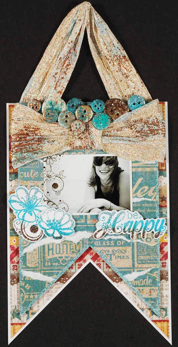 Place your pennant with the holes at the top. Cut a 4”x12” blue tag paper and tear into 5 horizontal strips of about 2 1/2” wide. Layer and glue the strips onto your pennant, trimming paper even with pennant edges. VersaMark™ the pennant edges, dust with Detail Capri embossing powder (glitter) and heat to set with the heat gun.