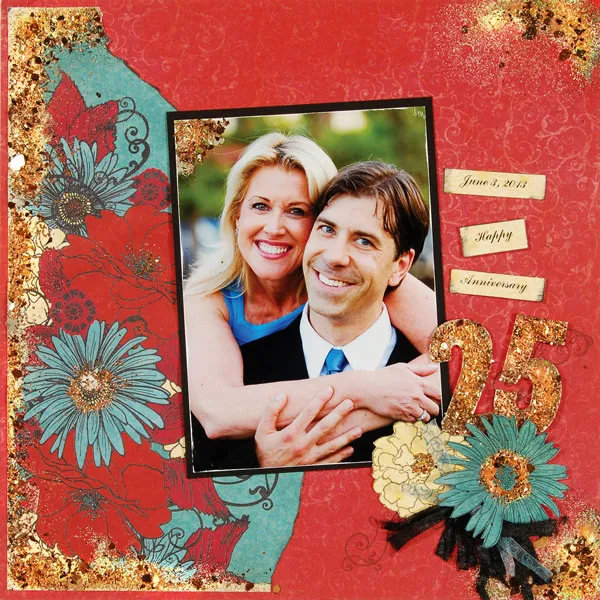Use Versamark™ at the top and bottom right corners on the red swirl paper. Sprinkle with embossing powder and then mixture of Jewels. Heat from the bottom until melted together. Glue the torn paper flower border to the left side of the page.