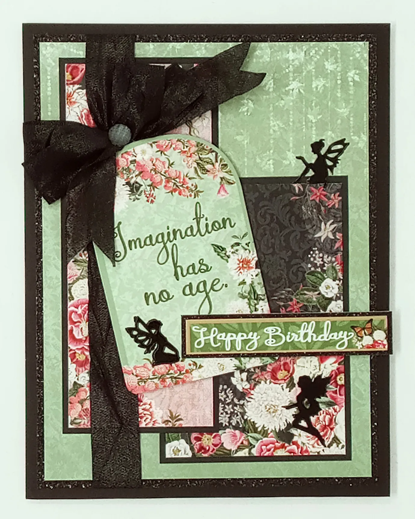 3. Foam tape the Fairy Garden “imagination has no age” tag die-cut angled as shown. Make a 4-loop black crepe bow and tie the center with thread. Glue the bow to the first ribbon, just above the tag.