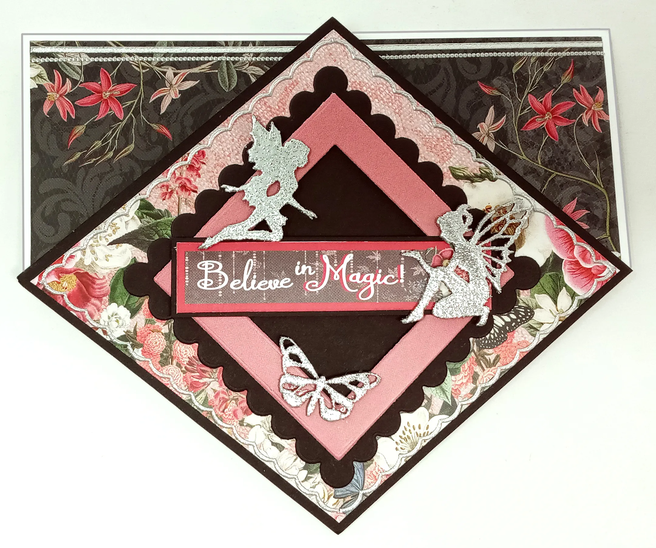 4. Die cut a 3" scalloped square from black cardstock and glue it centered on the diamond front panel. Die cut a mauve frame placing the 1¾" square die inside the 2½" square die. Foam tape the frame to the black cardstock. Mat the “believe in magic” cutout on black cardstock with narrow borders, then glue it across the center of the square.