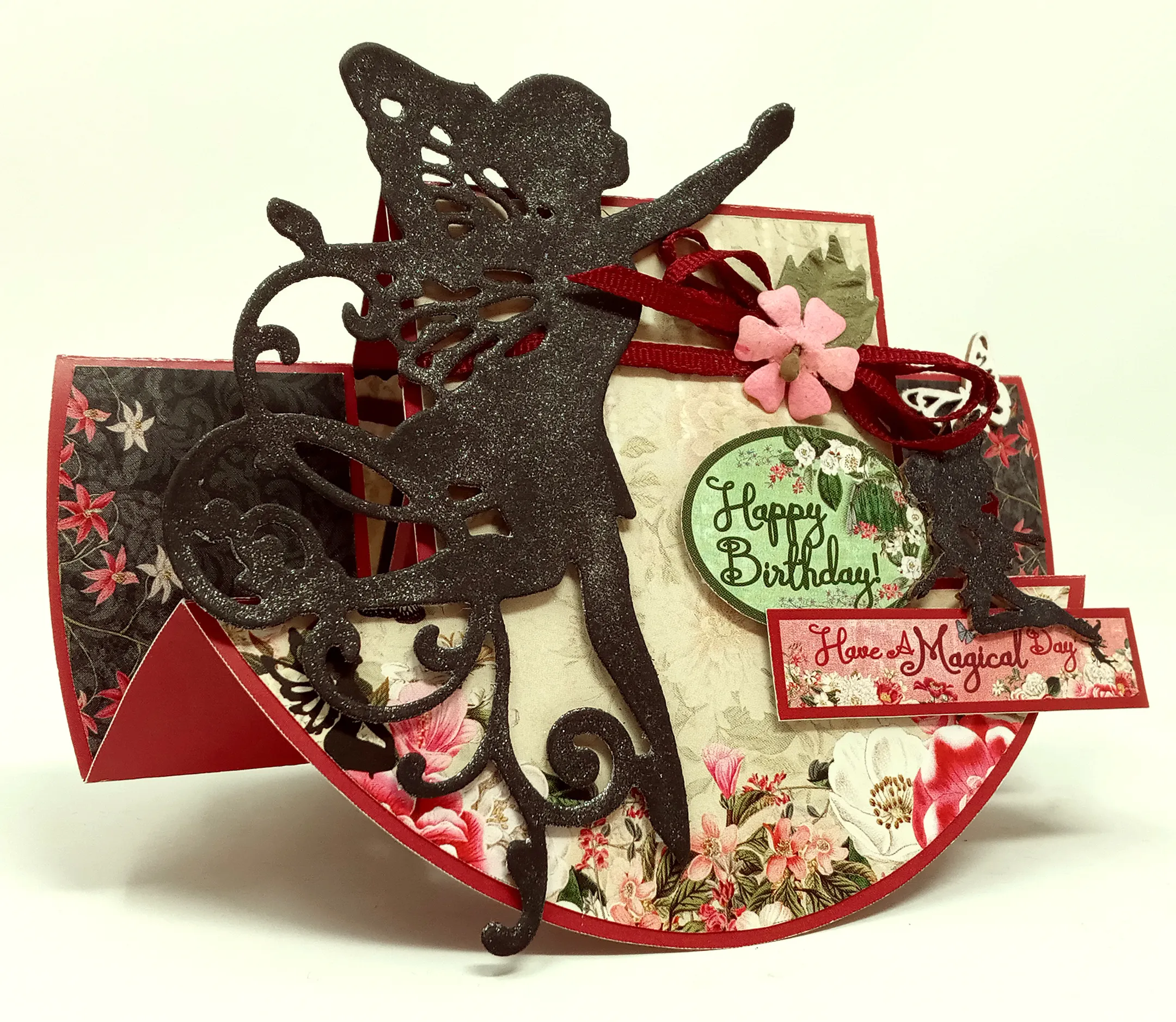 6. For the inside: Cut 6"x2¼" Fairy Garden yellow lacy cardstock with the lace at the top and glue it to the inside, aligning the upper edge with the card’s folds. Trim the excess along the card’s side edges. Mat the two Fairy Garden cutouts shown on black cardstock with narrow borders, then glue and foam tape them to the inside as shown. Knot a 3" length of ⅛" wide maroon grosgrain ribbon and glue it as shown.