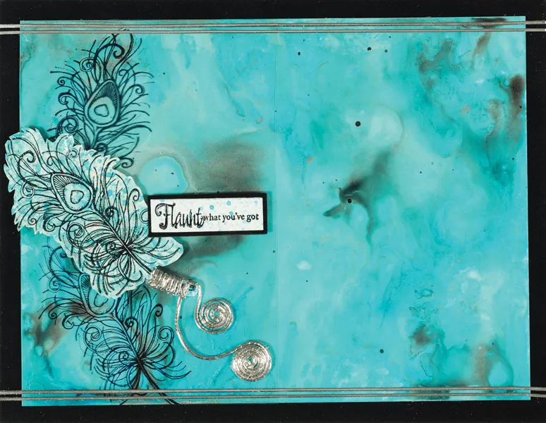 Stamp a feather on the lighter small turquoise piece. Cut out around the feather (save the rest for stamping the sentiments) and wrap a length of memory thread around the feather stem. Foam tape in place (as shown), coil the ends of the thread below and Zot™ or glue in place. Stamp “Flaunt what you’ve got” on a 1 3/8”x3/8” light turquoise piece. Mat on black with a 1/16” border and foam tape over the feather, as shown.