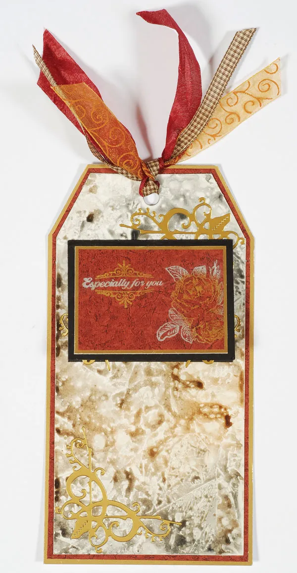 Mat the large tag on mottled paper, then on gold with 1/16” borders, and re-punch the tag hole. Place corner bracket Dazzles™ at the upper right and lower left corners. Glue the small card 1” from the upper tag edge. Open the card and place scroll fern Dazzles™ across the lower corners.