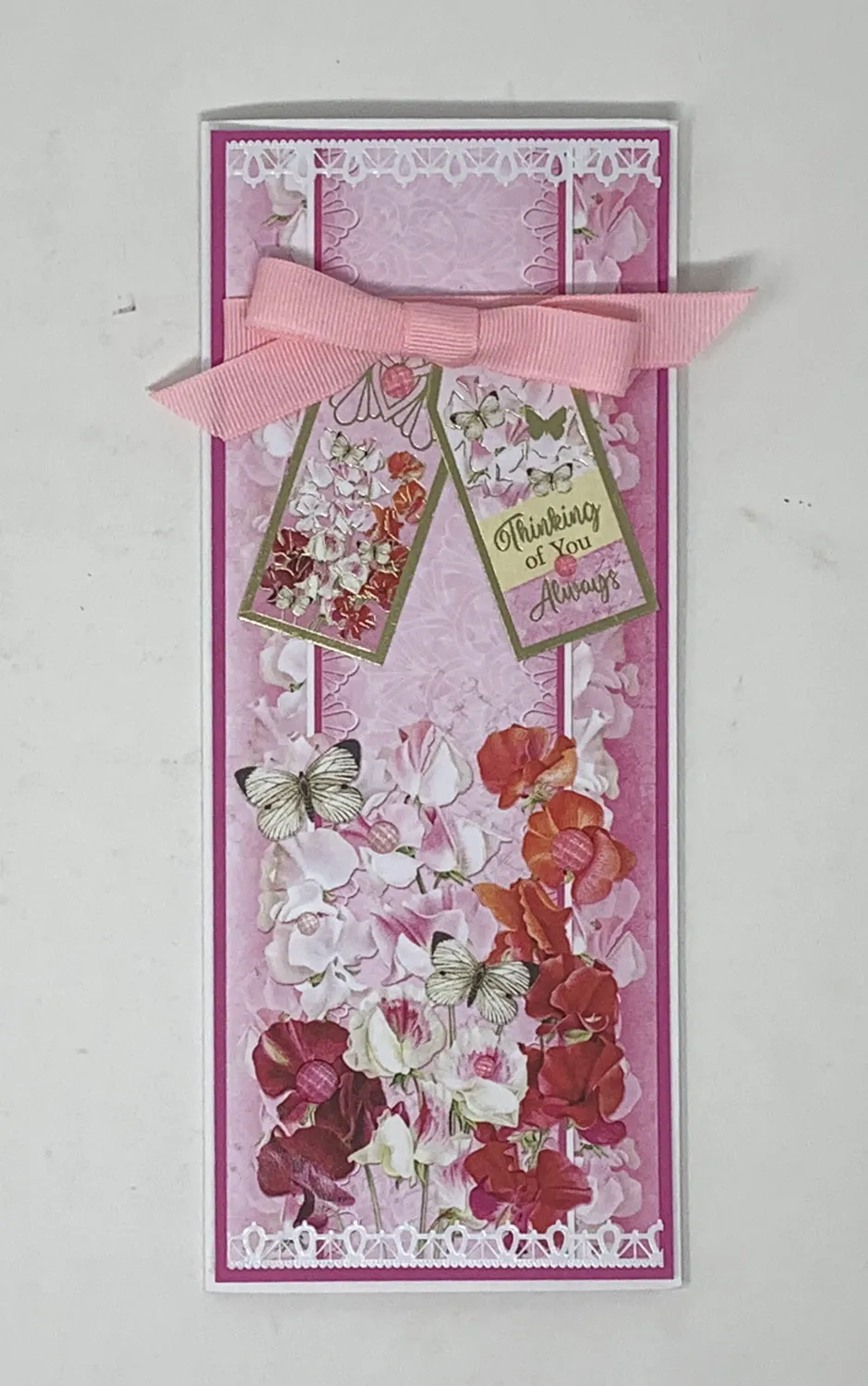 Cut 8 1/4”x 3 1/8” sweet pea patterned Adorable Scorable. Glue a pink ribbon 1” from the top and glue the ends to the back. Mat on dark pink Matt-Tastic Adorable Scorable leaving a 1/16” pink border. Glue to the card front leaving a 1/16” white border. Place white Fancy Border Dazzles™ to the top and bottom of the sweet pea Adorable Scorable. Make a 2 1/2” pink bow and glue to the ribbon. Glue 2 tags under the bow. Place Diamond Sparkles as shown.