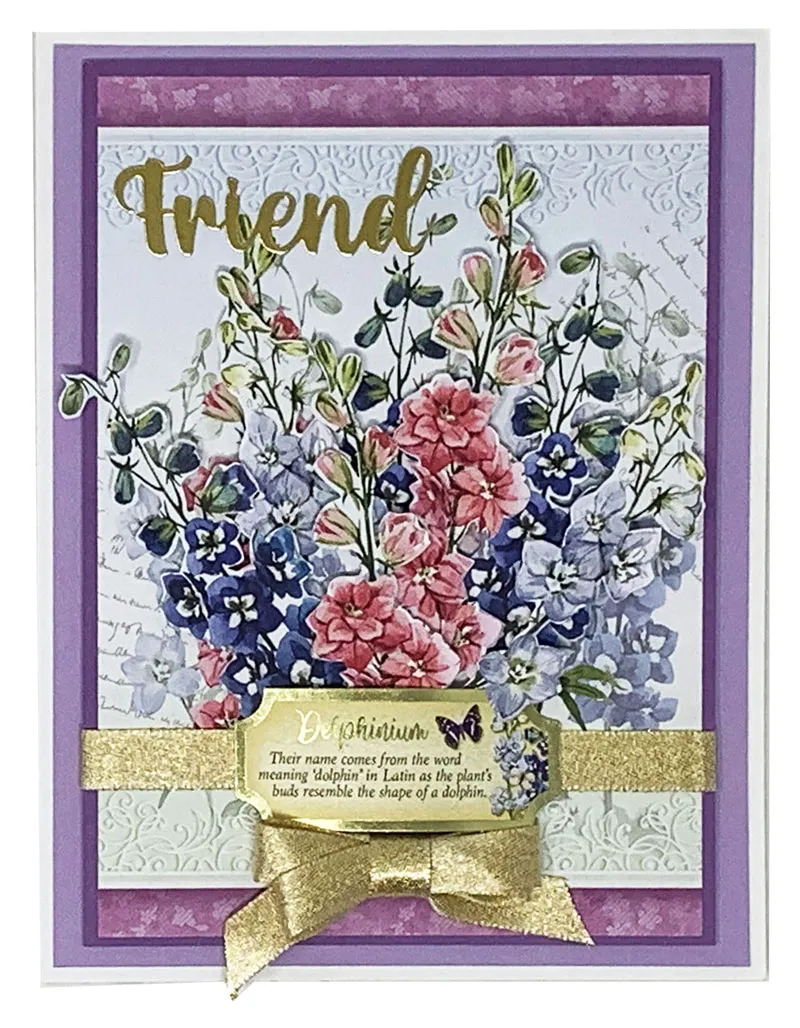Glue 4 ¾”x6 ¼” light purple Matt-Tastic Adorable Scorable to the card front leaving a 1/8” white border. Mat the Delphinium Little Book page on dark purple Matt-Tastic Adorable Scorable. Glue gold ribbon 1” from the bottom and glue the ends to the back. Foam tape to the card. Use a bone folder to curve the Delphinium label then Zot™ each end to the ribbon. Use the Professional Scissors to cut two of each delphinium from the Little Book sheets and foam tape tucking each end under the label. Zot™ a 2” wide gold bow under the label.