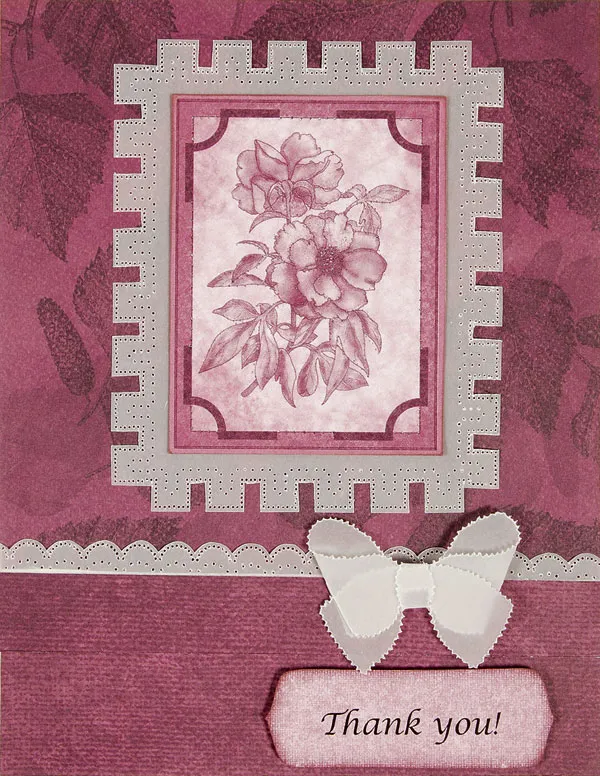 Cover front of the card with burgundy leaf paper and tuck under the folded flap.
