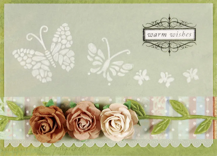 Use the Butterfly piercing template to emboss the butterflies on the back of the parchment. Stamp “warm wishes” at the top right of the parchment. Back the rectangle with white paper behind the parchment, adhering with glue stick.