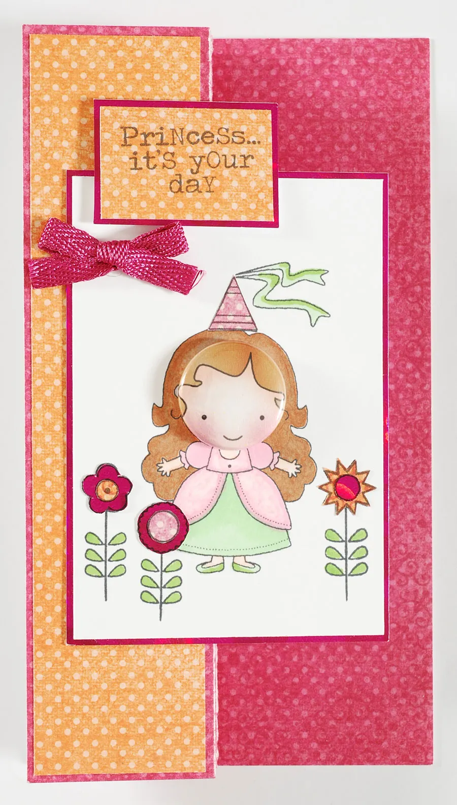 Use Memento ink to stamp “Princess… it’s your day” on a 1 1/2”x1” Grapefruit pink dot paper, and “Dream big…” on a 1 1/2”x1” Grapefruit orange dot paper. Mat each on Pink Hearts paper with a 1/16” border and foam tape as shown. Zot™ three small Grapefruit pink glimmer ribbon bows as shown. Zot™ on tin pins, as shown.