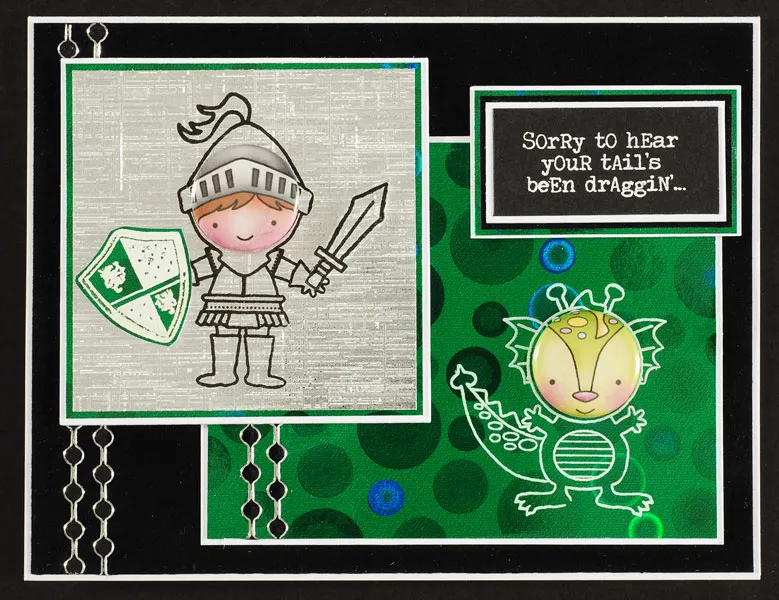 Stamp and emboss the knight in black on the center of a 3” square of silver linen paper. Mat on green circles paper, then on white cardstock with 1/16” borders and foam tape 3/8” from the upper left corner, as shown.