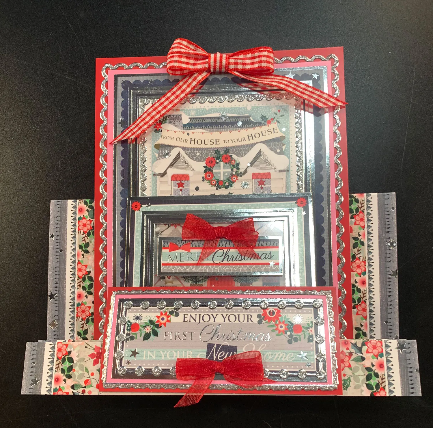 Mid-tier: Remove outer frame from medium corresponding topper and use Extra Sticky Tape to attach Snowfall Acetate to the back and trim to fit. Foam tape the sentiment die-cut to the acetate as shown. Zot™ a bow on top. Foam tape the bottom of the piece to the center tier.