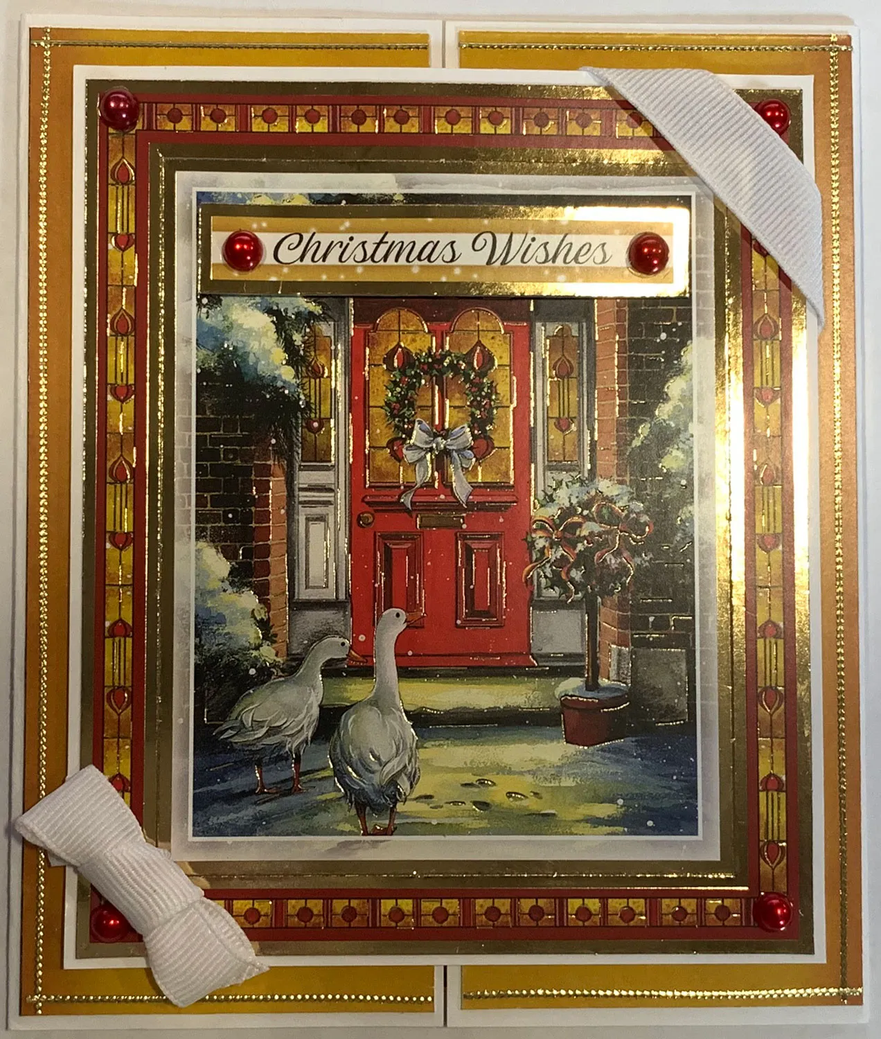 For the card base cut the foiled Adorable Scorable to 11 5/8”x5 3/4”. Score and fold in the middle. For the shaker: Use the large orange frame topper and remove the bird image, leaving two outside frames. Glue the bird die-cut to the center of the card. Cut a 4 1/4” square piece of the Snowfall Acetate. Attach the double frame with Extra Sticky Tape to the outside of the Acetate. Place 2 layers of foam tape along the acetate edges. Put about a tablespoon of buttons on the bird image and attach the Snowfall frame on top. Glue the sentiments and Zot™ a bow as shown.