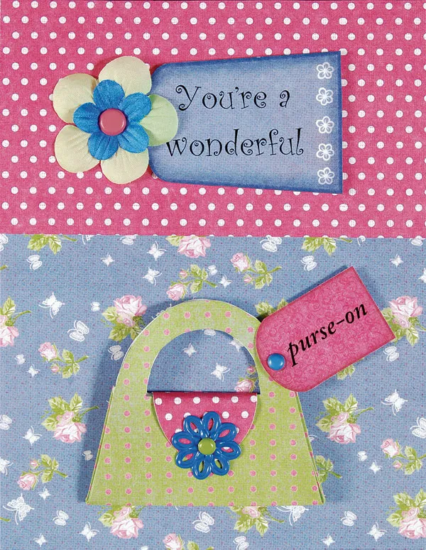 Cover the card front with blue floral paper. Cut out a 2 ¼”x 5” rectangle from the pink dot paper and glue to top of the card front. Journal the “You’re a wonderful” and “purse-on” tags on blue and pink tags from Little Prints & Patterns. Foam tape the larger blue tag centered on the pink dot, ¾” from the top. Layer fabric flowers and attach with a brad, adhere to blue tag.