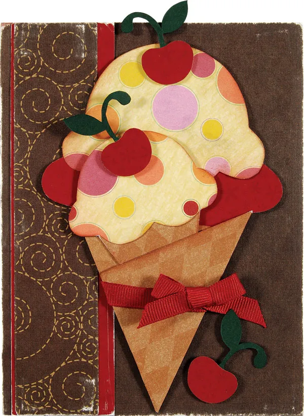Pocket: Trace the pocket of the Yummy Ice Cream Cone on brown diamonds paper. Cut out then chalk the edges. Fold with the brown on the outside. Trace and cut a large scoop from red shine. Trace and cut a scoop from yellow circles paper. Chalk the edges brown then glue on the cone. Wrap the brown cone pocket with red ribbon then Zot™ a bow on the front. Trace and cut out four cherries from red shine. Trace and cut four stems from green cardstock. Glue one behind each cherry. Foam tape one on top of the ice cream cone and another on the card below the bow. Set the remaining two