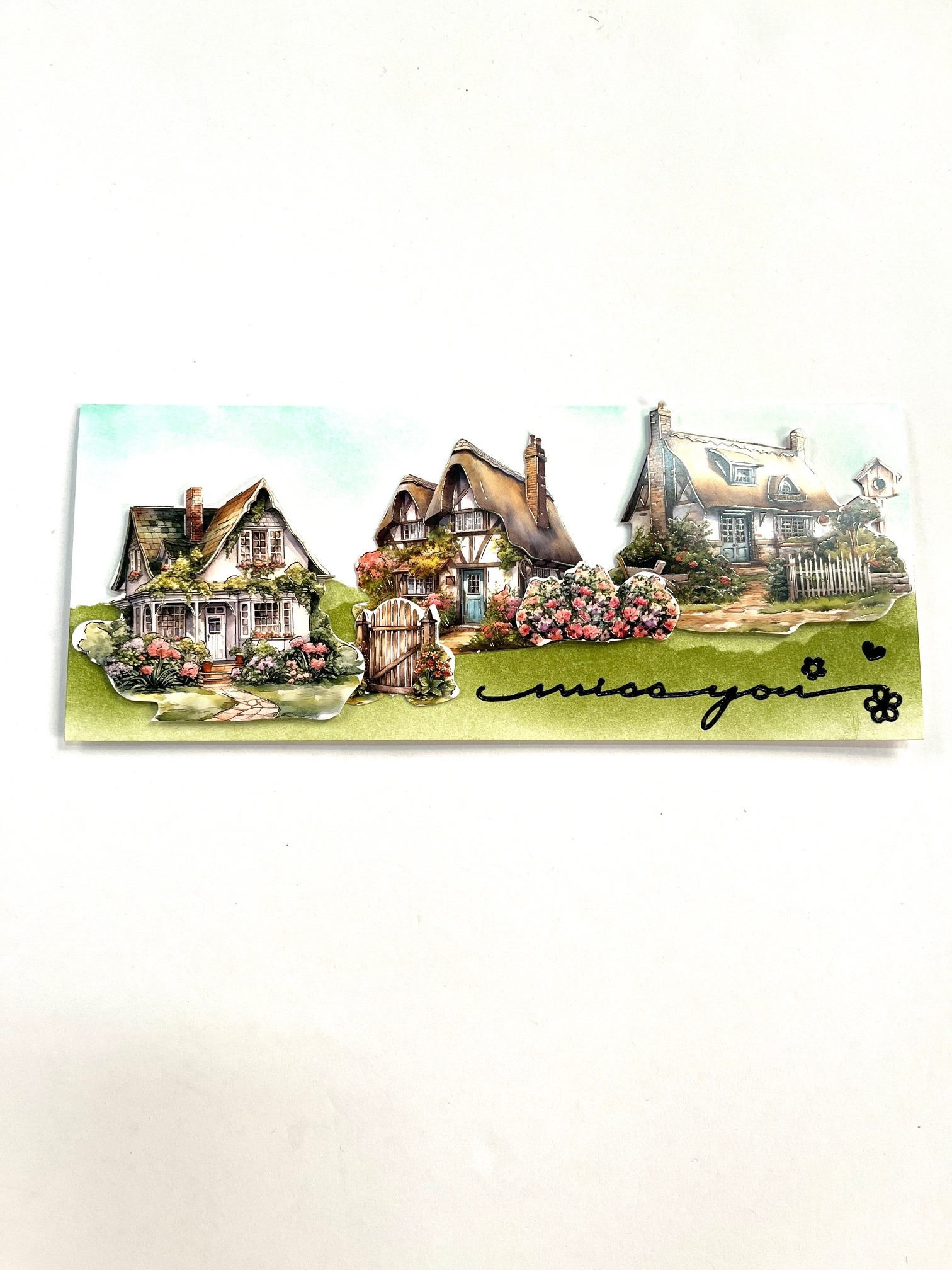 Select a slim line card and orient so the fold is at the top. Open and place on craft mat. Cut 8 ½”x3 ½” piece of scrap paper. Tear with hills and valleys. Place so the bottom 2” of card is exposed and go over with khaki ink pad using a blender brush. Go over again but move the paper over a bit then apply ink. With a clean blending brush go over the rest of card front with powder blue ink to create the sky. Glue and foam tape the houses, gate, birdhouse and flowers as shown. Place “Miss You” script Dazzles™️ on the bottom right.