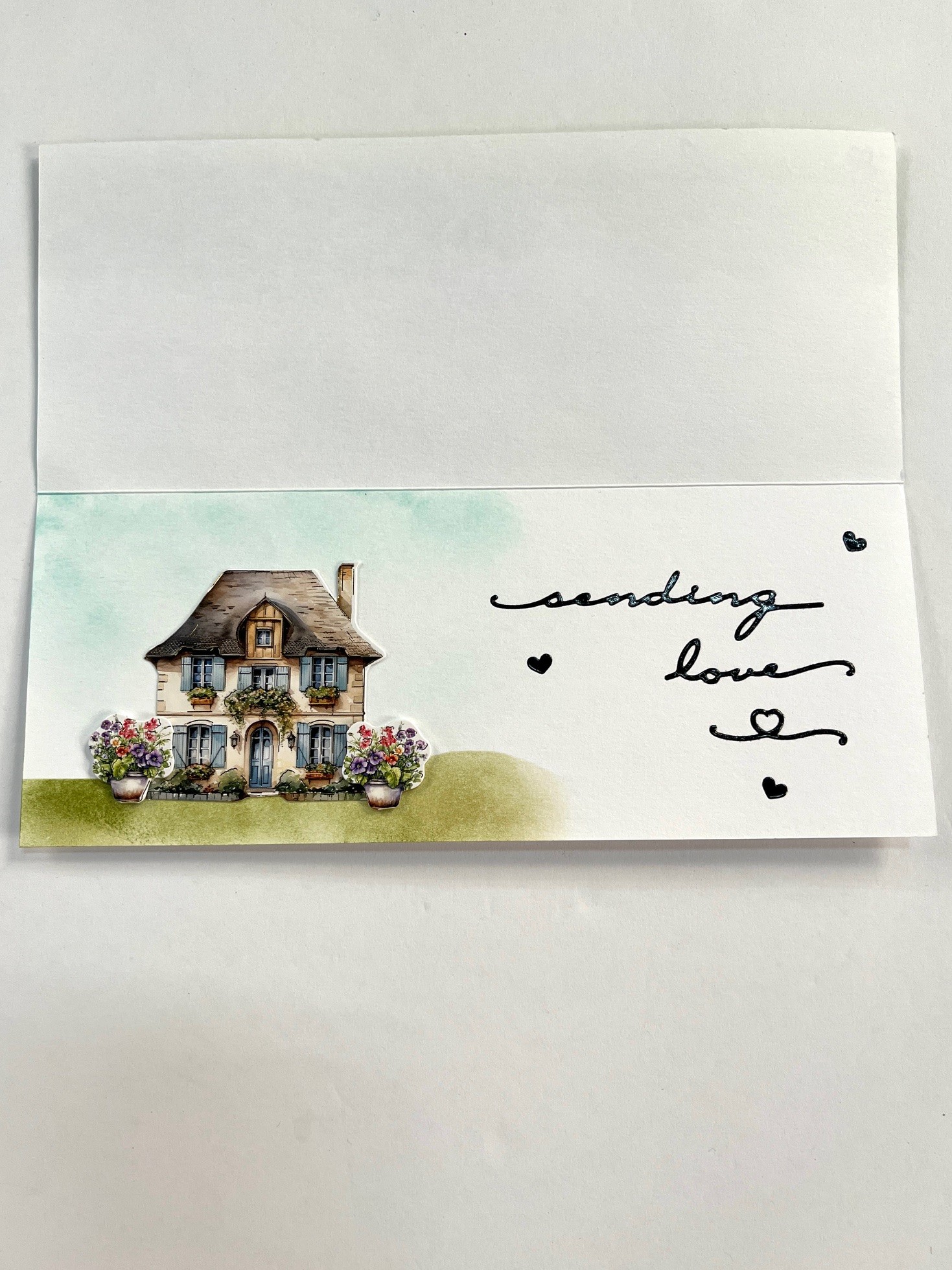 Card inside: Ink the sky lightly with powder blue ink. Use khaki ink pad on the bottom left area. Tape house and foam tape flowers as shown. Place “sending love” script Dazzles™️ to the right as shown.