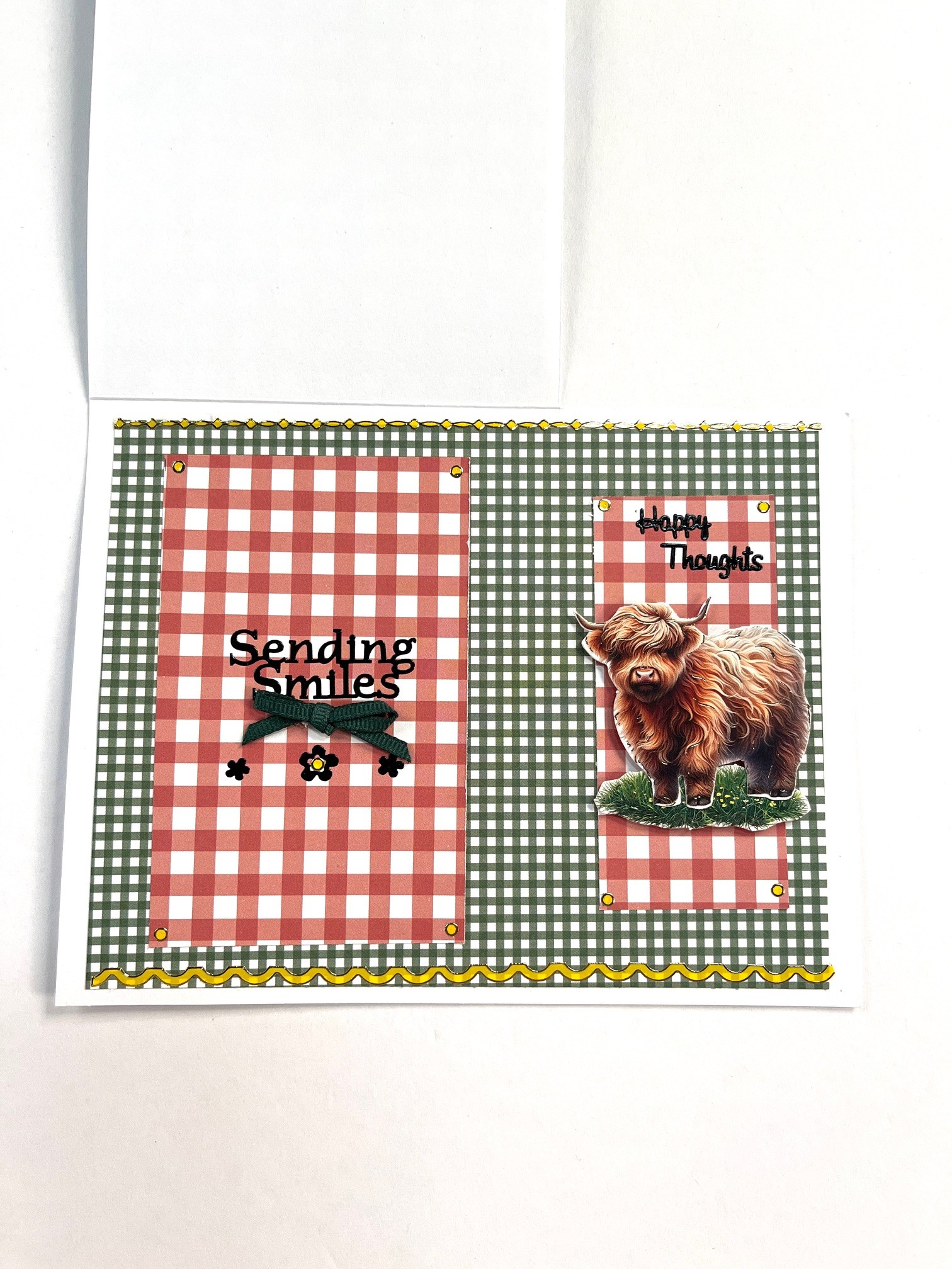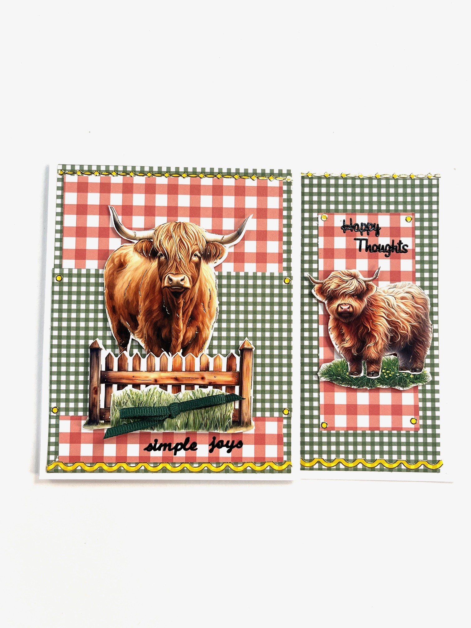 1 1/2”x3 1/2” and tape to card base leaving 1/2” on the bottom and 1/4” on the right green gingham borders. Foam tape grass patch and cow from the Delightful Die-Cuts in the center as shown. Place “Happy Thoughts” Dazzles™️ above the cow. Place remaining Dazzles™️ as shown.