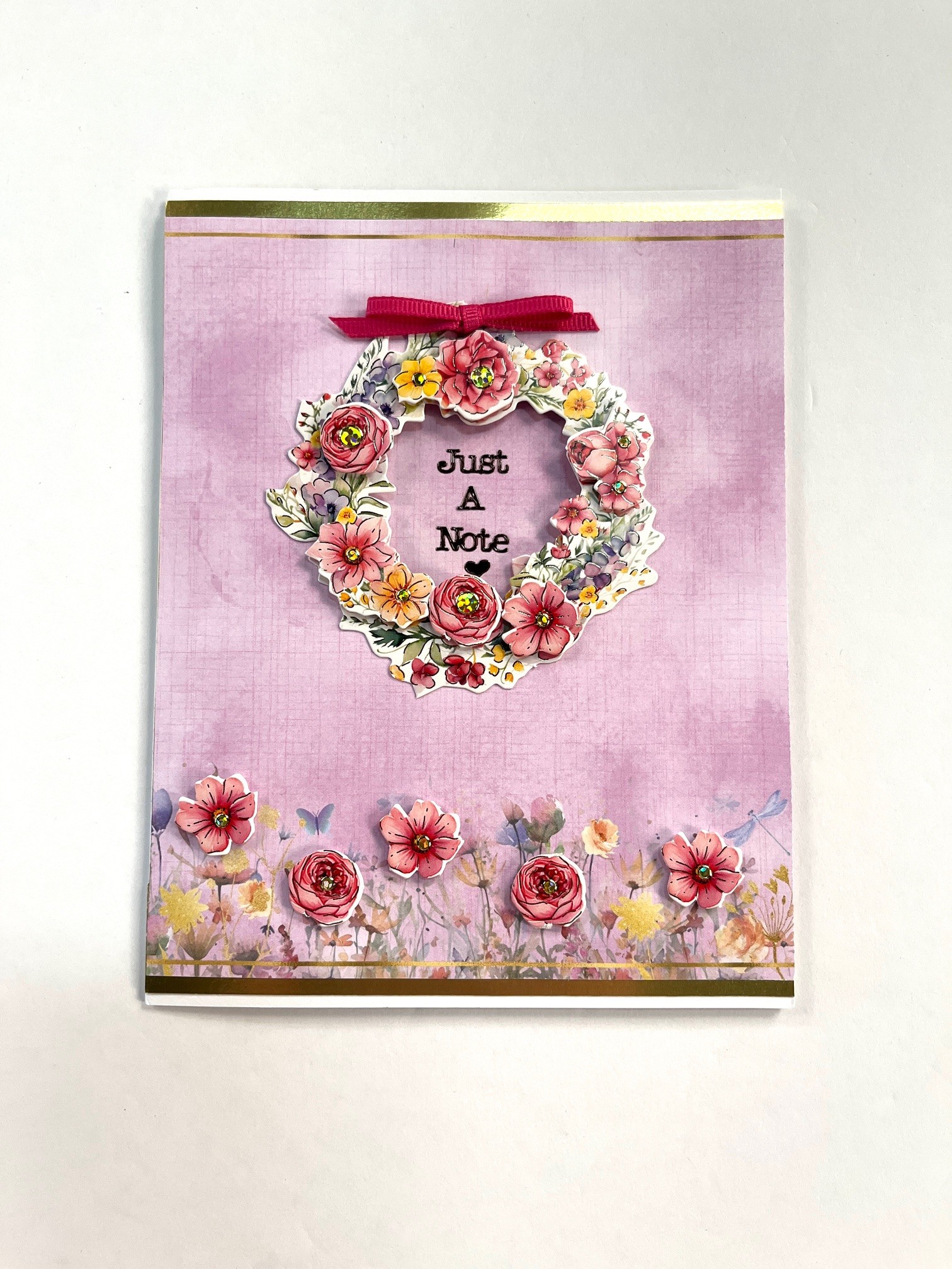 Use the die-cuts from the yellow page from the Delightful Die-cuts A5 Pad Wonderful Wildflowers. Glue the wreath around the evacuated circle area on the card front. Foam tape additional flowers on the wreath and flower border. Place gold Jewel Dazzles™️ on flowers as shown. Make and Zot™️ a 2” wide pink bow from the 1/8” Ribbon Set on the top of the wreath.