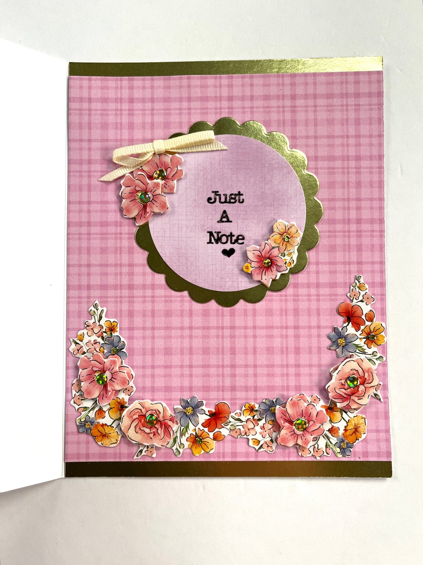 Card inside: Cover card base with glue, lay gold metallic cardstock on top flush to fold and one side, turn over and trim off excess. Cut 5”x6” pink plaid Watercolor Wildflowers cardstock and glue leaving 1/4” gold borders. Use the 3” wide scalloped circle cutting die on gold metallic cardstock and glue 1” from top and sides. Tape the evacuated circle from the front onto the center.