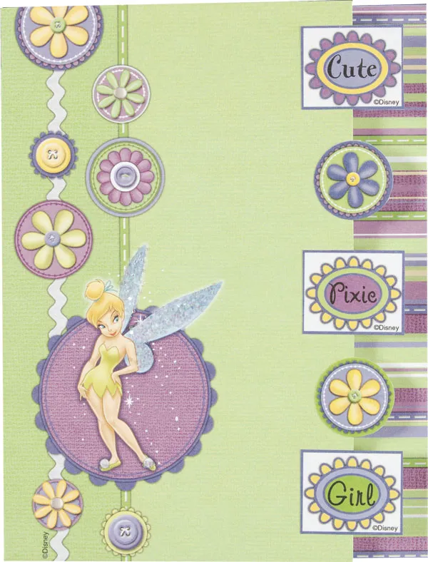 Place the card fold on the left. Cut ¾’ from the card front right edge. Cover the card front with the Tink border paper. Use a paintbrush to apply glue to Tink’s wings and sprinkle with glitter. Glue cut-outs to the right edge.