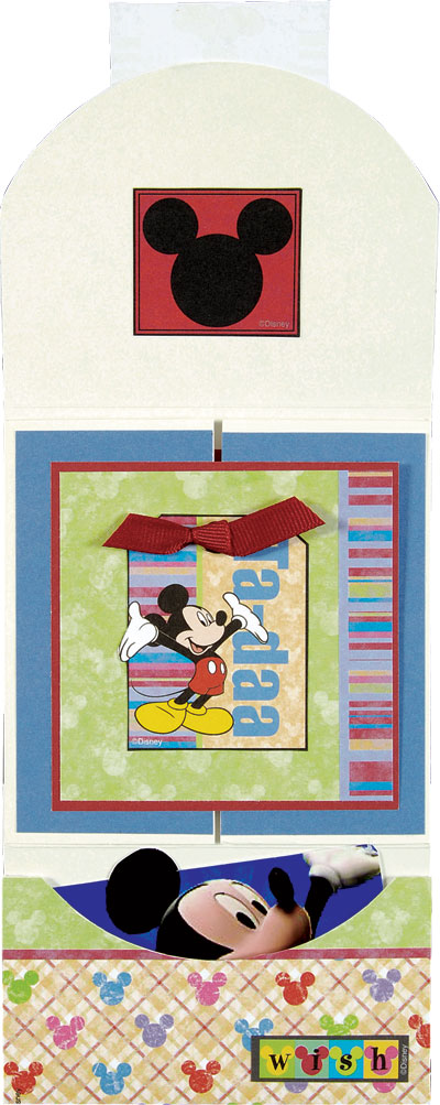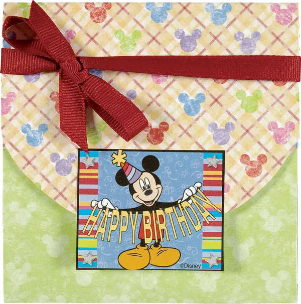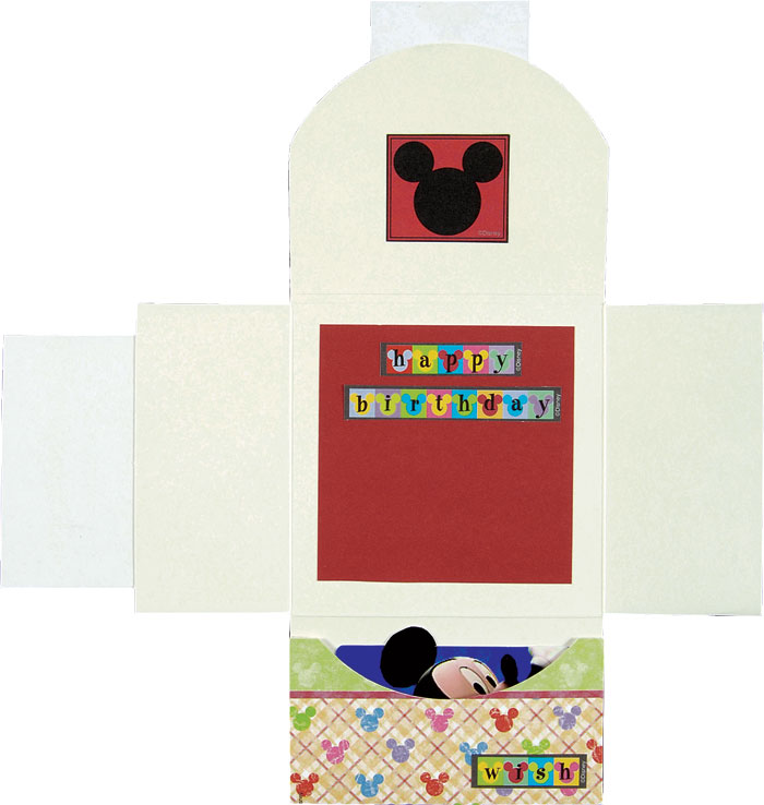 Line the inside back with red paper and glue “Happy Birthday” cut-outs to the top. Glue the red Mickey head cut-out to the inside flap. Place a gift card in the pocket, fold and secure the outside with a red ribbon wrapped around the top.