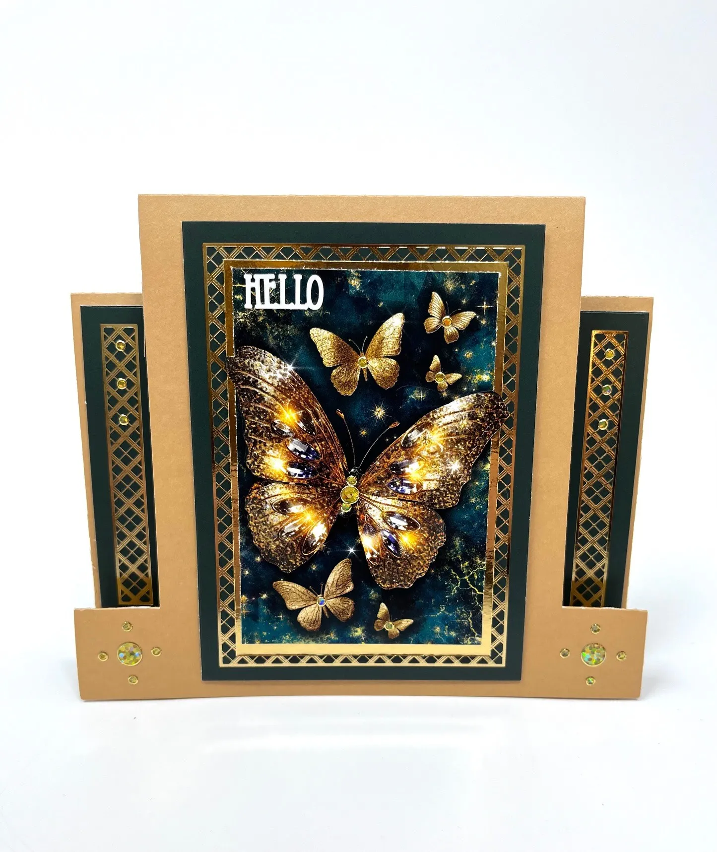 Trim 1/4" from all sides of the selected butterfly page and mat on gold Mirri leaving a 1/16" gold border. Foam tape to the green center section. Cut out two more large butterflies, curl the wings and foam tape the bodies over the original butterfly as shown. Place "Hello" Dazzles™️ in the top left corner of butterfly page. Place gold Jewel Dazzles™️ on the butterflies and the card as shown.