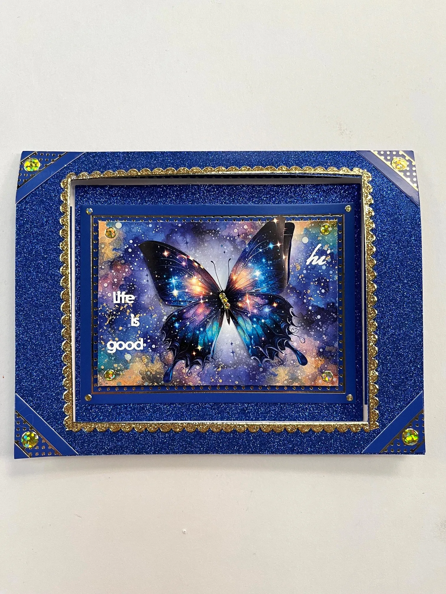 Cut 1/4" off each side of the selected butterfly page and foam tape to the center of the kinetic card section. Cut out two more of the butterflies, curl the wings, and foam tape just the bodies over the matching art. Place gold jewel Dazzles™️ as shown.