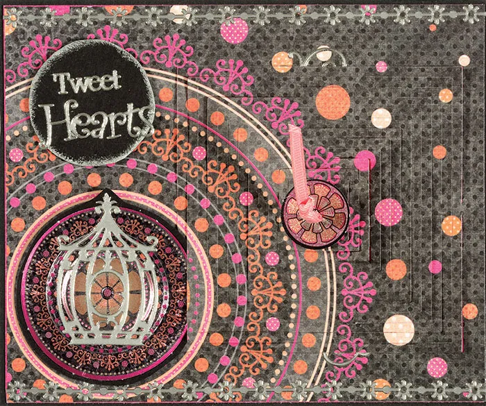 Place a birdcage Dazzles™ on a 2 1/8” Grapefruit paper tole circle. Mat on black cardstock with 1/16” edges. Foam tape to the circle in the bottom left corner. Trace the 1 ½” paper tole circle onto black cardstock. Ink the edges with the silver ink. Place the “Tweet Hearts” Dazzles™ on the circle and foam tape to the top right corner. Place the border Dazzles™ on the top and bottom.