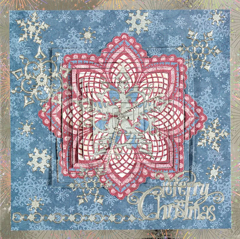 Cut a 5 ½” square of Christmas Lace blue snowflake paper. Glue the Christmas Lace pink/blue lace snowflake to the center. (Make sure it has glued all over as it will be cut in several places.) Place the “Merry Christmas” Dazzles™ in the bottom right corner. Place a large snowflake Dazzles™ in the center of the die-cut. Place the border to the left of the “Merry Christmas”. Place the other small snowflakes around the card as shown.