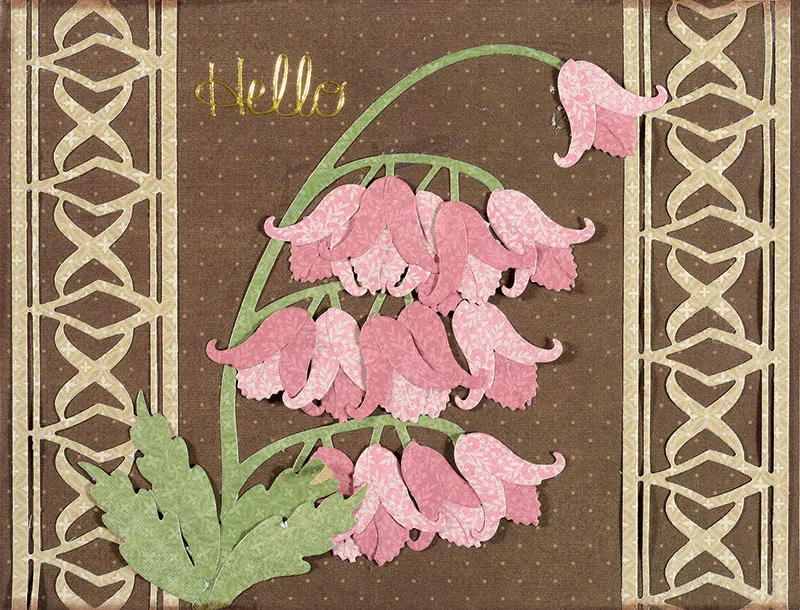 Die Cut Kindred Spirits pink and mauve Chickadee small shapes. Glue two shapes together in a bell shape and 2 toothy shapes facing each other to make the flower center. Glue center to extend from under the bell. Place several of the bell shaped blossoms upside down on the mouse pad or foam sheet and make an indentation. Glue flowers to the stems and foam tape 2 or 3 dimensional flowers on each branch and one at the top. Place “Hello” Gold Greetings Dazzles™ at the top of the card.