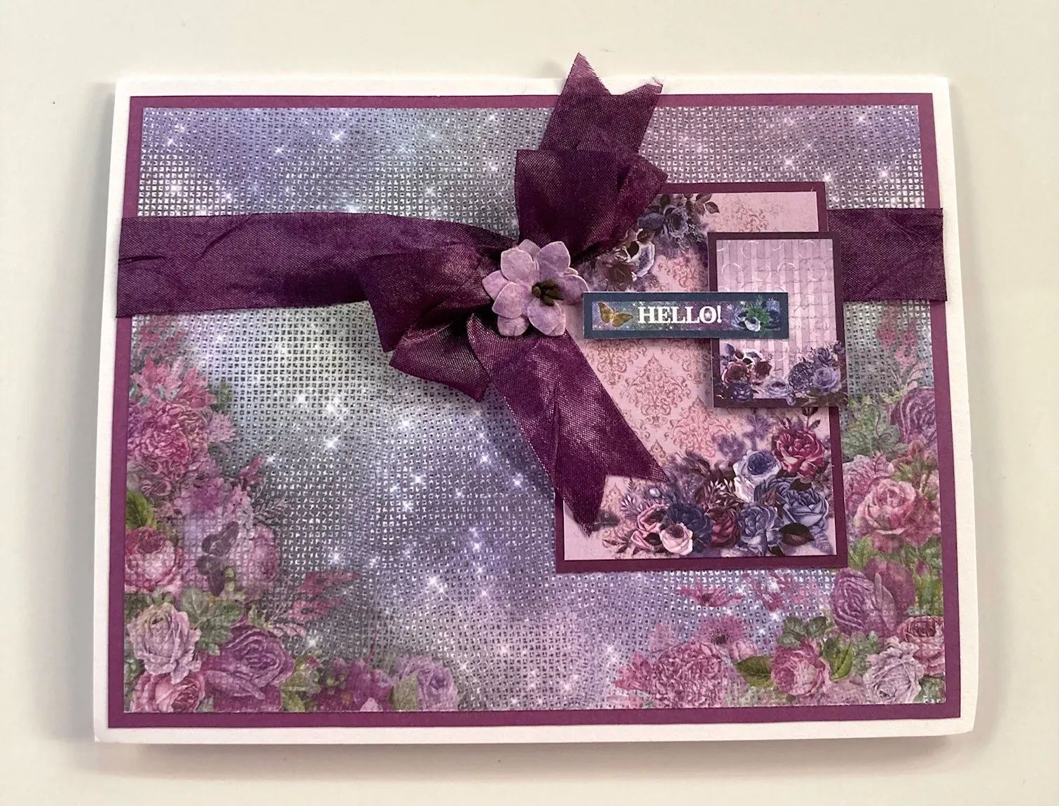 1. For the card front: Cut 6"x4½" Mystic Moon lavender textured cardstock with flowers in the lower corners and mat it on purple cardstock with ⅛" borders. Wrap purple crepe ribbon across it, ⅞" from the top, and glue the ends to the back. Glue the cardstock centered on the front.