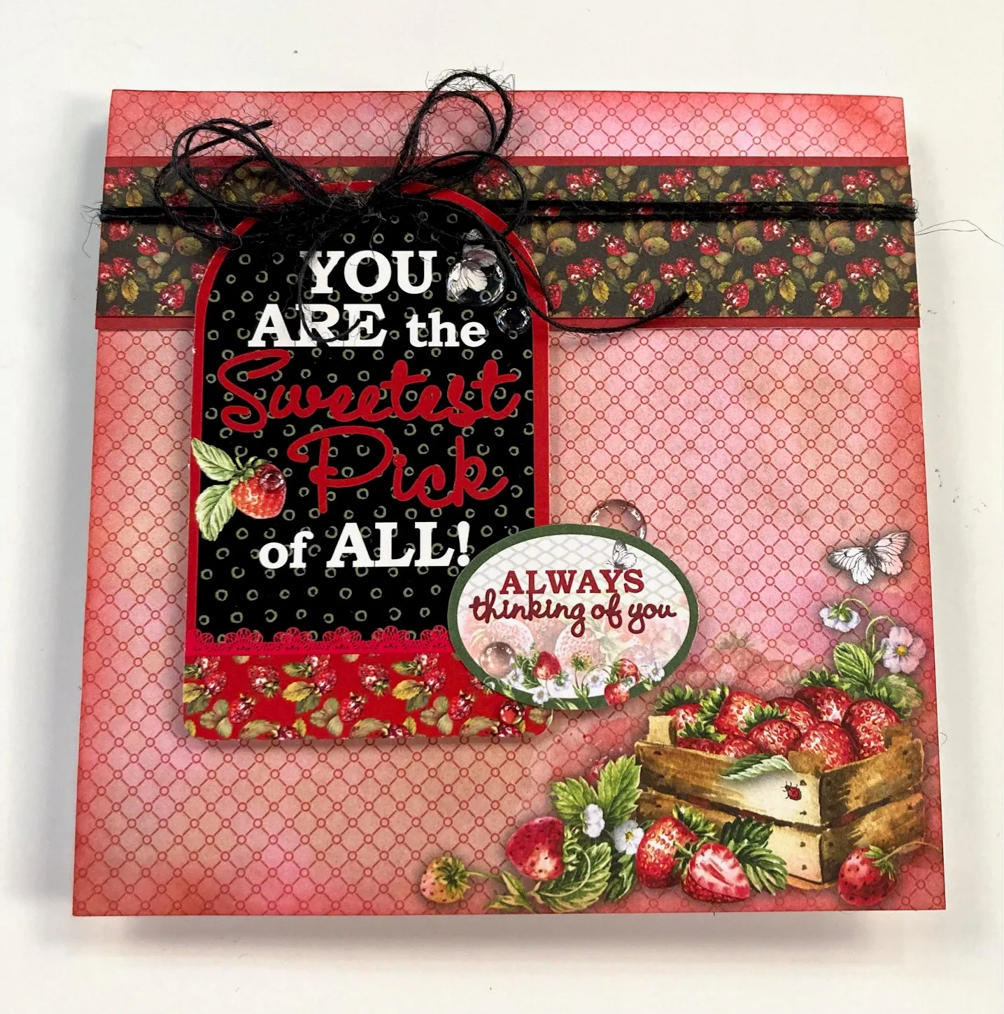 1. For the card front: To create the 5"x5" card, place the card with the fold at the top, then trim 1½" off one end. Cut 5"x5" Strawberry Delight pink mesh cardstock with the crate in the lower right corner and ink the edges with Red Earth. Glue it to the card front. Cut 5"x1" black/red cardstock and mat the long edges on red cardstock with ⅛" borders. Wrap black jute twice across it near the upper edge and glue the ends to the back. Glue it ½" from the card top.