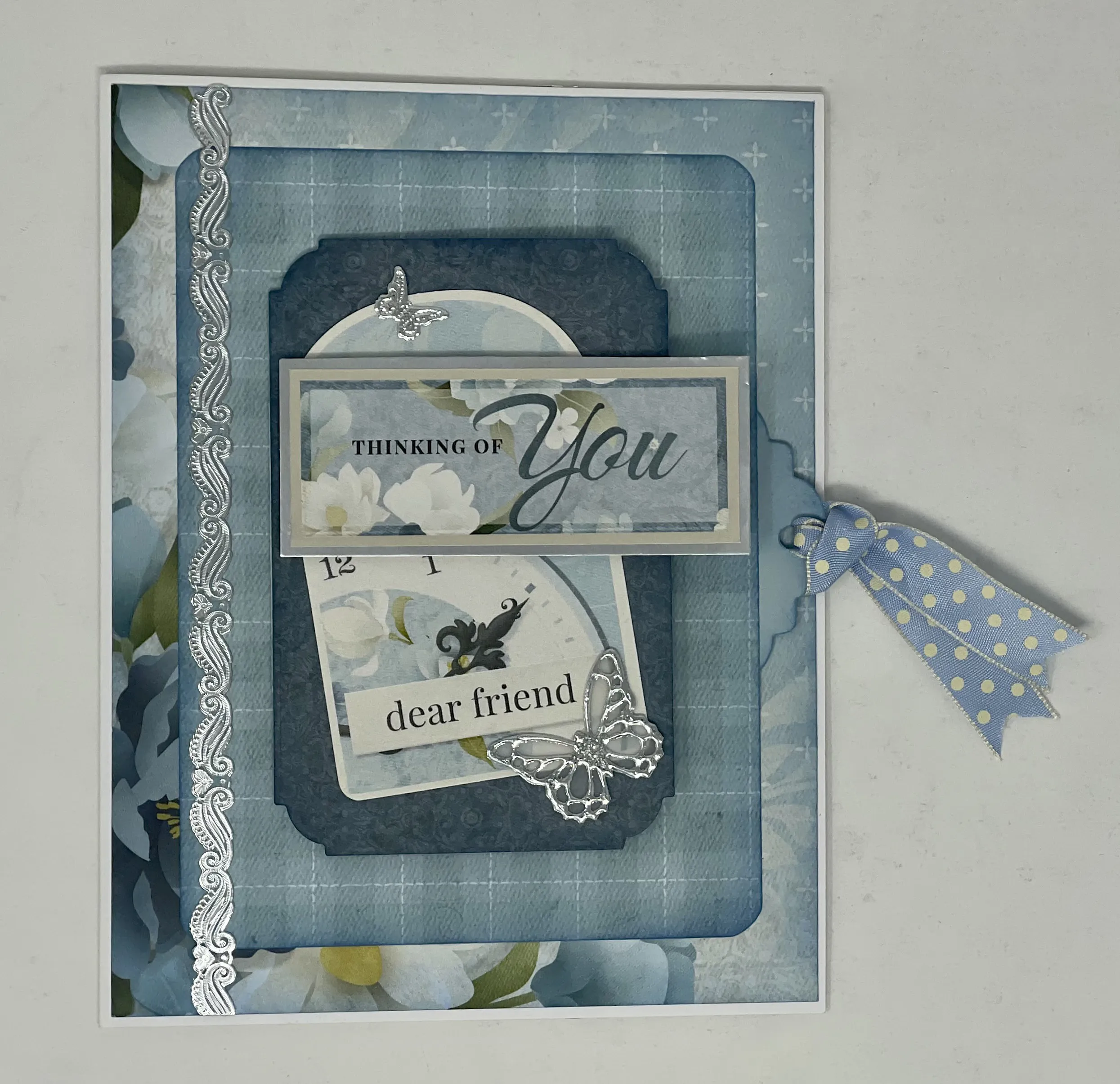 3. Mat the “thinking of you” cutout on Silver cardstock with 1/16" borders, then foam tape it to the outer flap as shown. Place a 1⅛" silver butterfly Dazzles™ on vellum and cut along the edges. Glue it and place a ¾" silver butterfly Dazzles™ on the outer flap as shown.