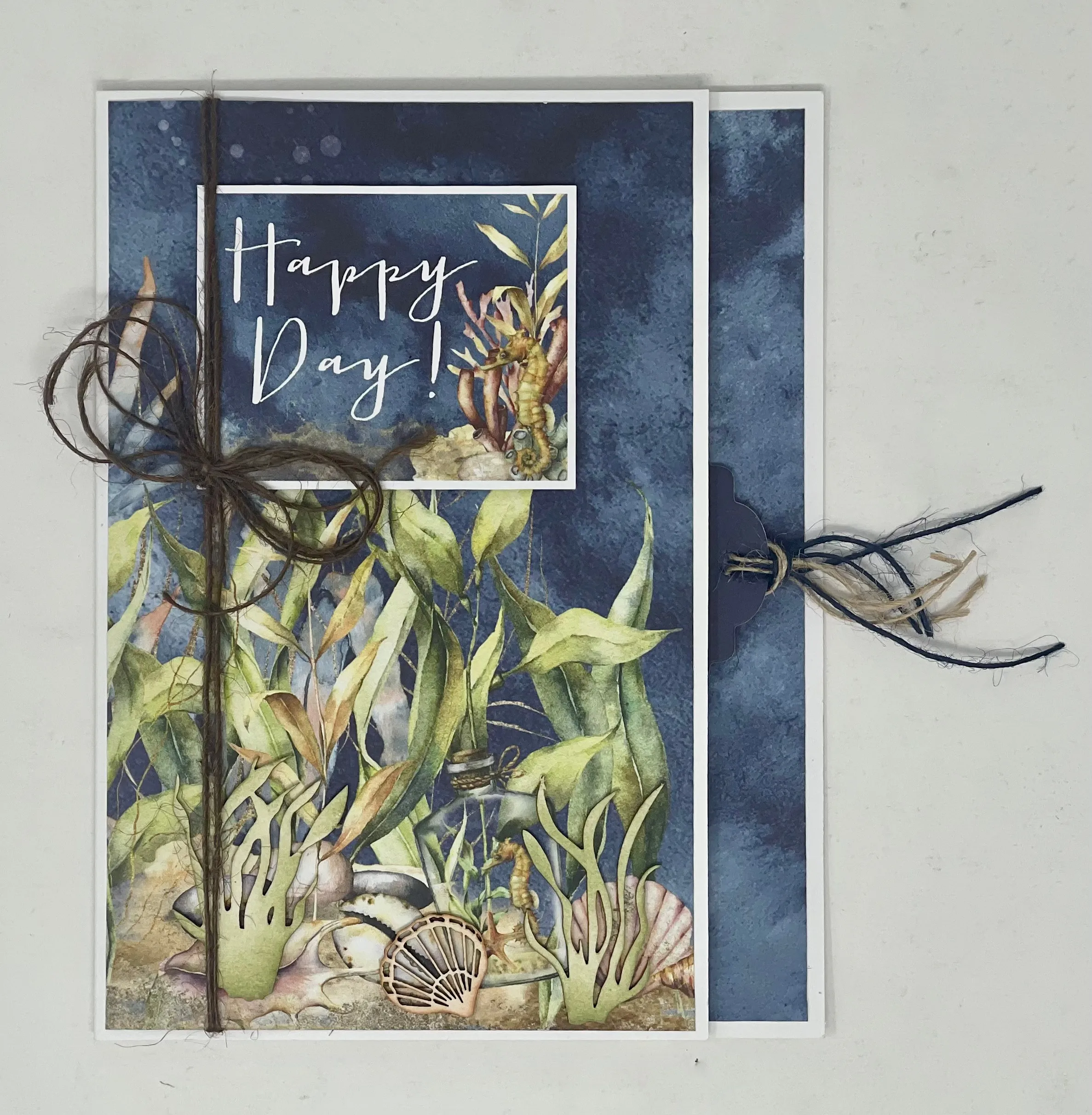 1. For the card front: Open a white card and cut ¾" off the right front edge. Close the card and place it with the fold on the left. Cut 4"x6¼" Seascapes & Sand seaweed cardstock. Wrap two brown jute strands vertically over the cardstock, ¾" from the left edge, and glue the ends to the back. Glue the cardstock centered on the card front.