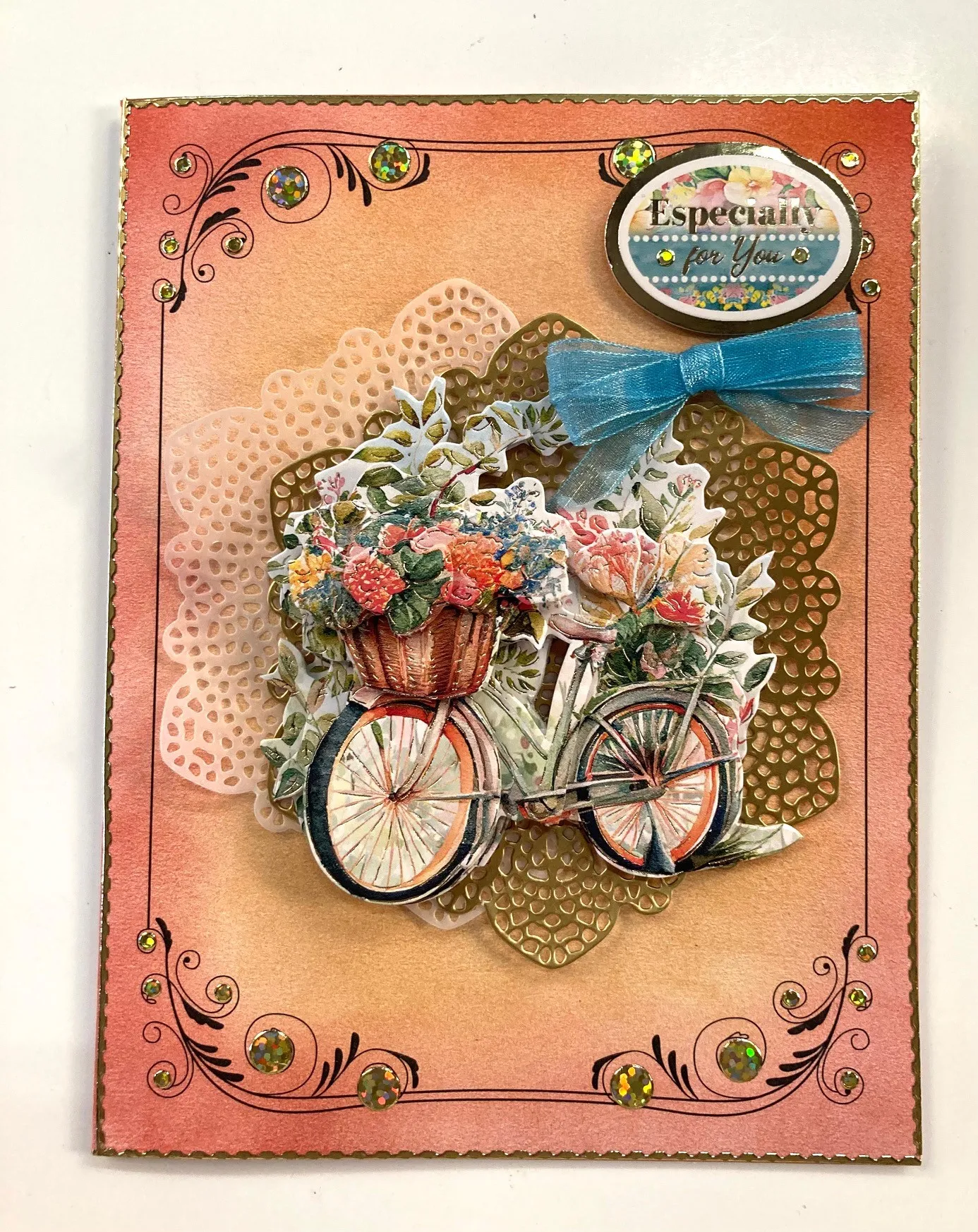 Card front: Use blending brushes to apply ink in a light circular motion starting off the card with the darkest ink on the outer edges and the lightest in the center. Place Thin Line Dazzles™️ on the outer edges. Add gold Jewel Dazzles™️ to the Dazzle™️ ‘em card design as shown. Die cut the round lace design from the Luscious Lace cutting die set once in vellum and again in gold paper. Attach the vellum with the tape runner along the center left and the gold to the right as shown. Use foam tape to attach the layers to the bicycle from the "Wheelie Great Days" Topper sheet. Foam tape this completed piece to the center of the die cuts. Foam tape the "Especially for You" Topper to the top right corner. Make and Zot™️ a 2" wide teal bow below it.