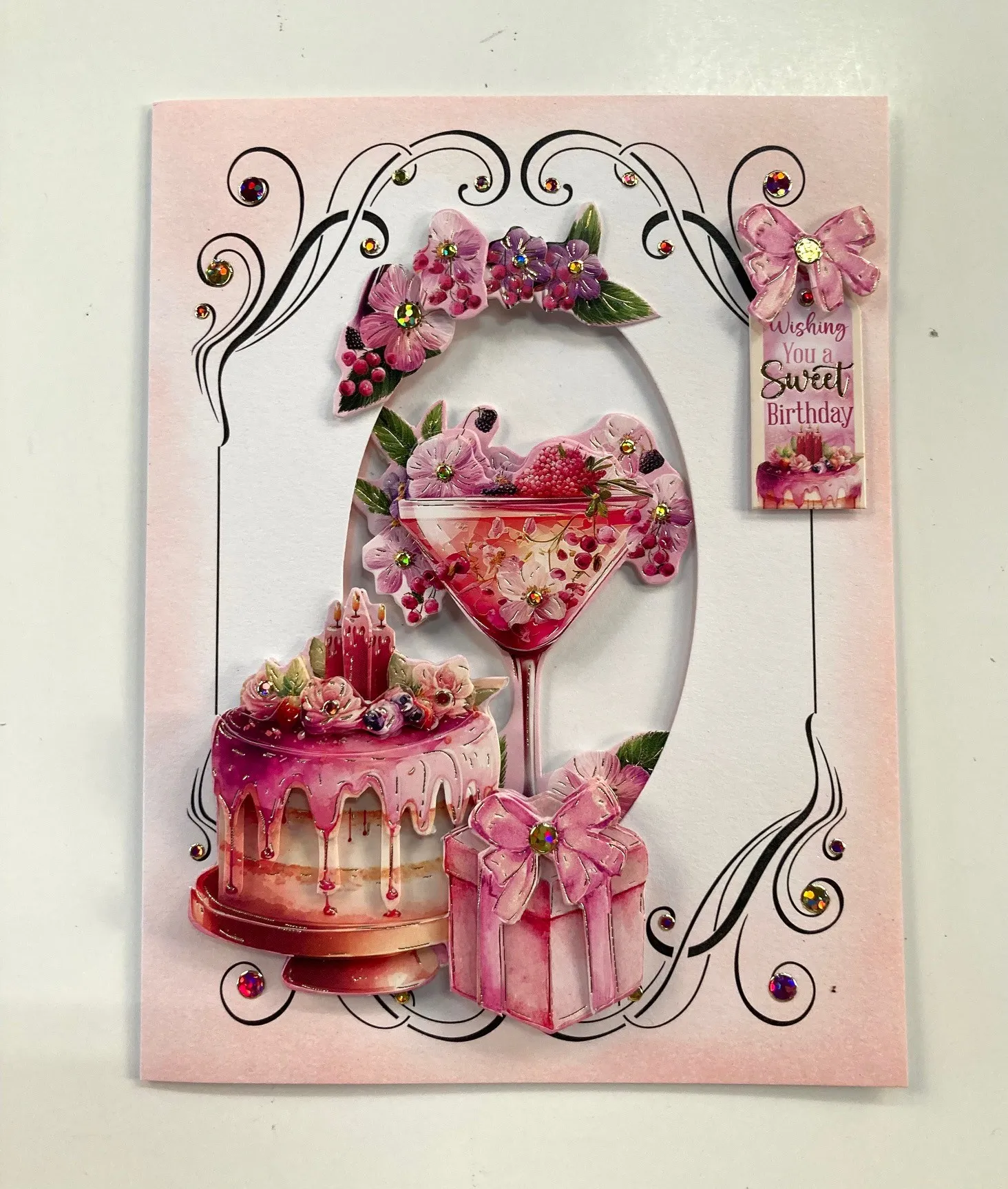 Foam tape the layers of the cake and gift from the "A Sweet Birthday" Topper sheet. Glue it along the bottom left of the window only placing foam tape where it isn't seen on the other side of window. Save 2 of the bows for later. Zot™️ two of the extra flowers along the top of window and foam tape the remaining flowers between them. Foam tape the topper tag 1/4" to the right of the edge and foam tape the bow on top. Place Dazzles™️ on the Toppers as shown.