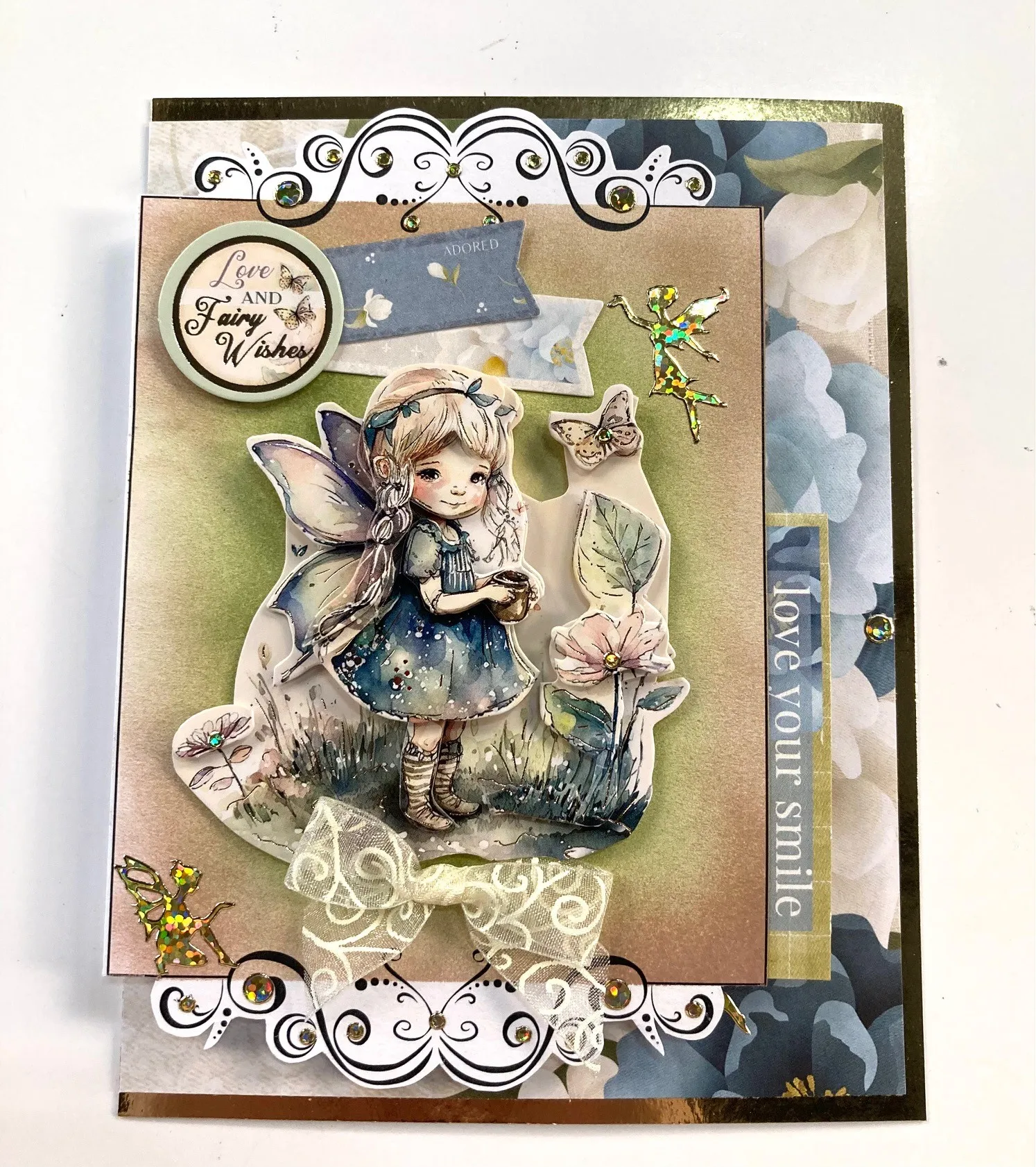 Select the "Fairy Wishes" Topper collection and build the fairy Topper with foam tape saving one fairy for inside. Foam tape the fairy Topper in the center. Select the two banner Magnolia Blossoms die-cuts and Zot™️ 1" from the left. Foam tape "Love and Fairy Wishes" Topper on top of the banner ends. Make and Zot™️ a 1 1/2" ivory bow below the Fairy Topper. Place gold Jewel Dazzles™️ in the flowers and position a fairy Dazzles™️ in the top right and bottom left corners. Use extra sticky tape to secure the "I love your smile" die-cut along the bottom right edge of the card front.
