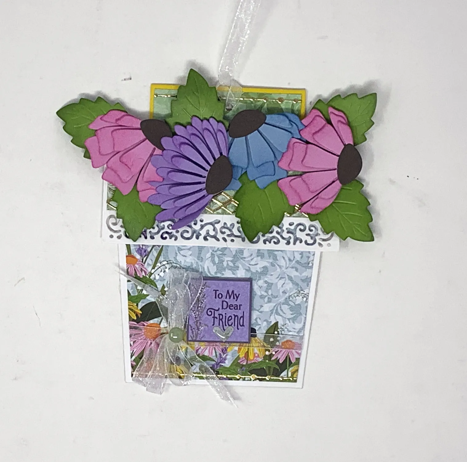 For the flowerpot: Fold 5"x8½" white cardstock in half, then place the pot die on it with the lower edge extending ½" off the fold. Die cut the pot. Trace and cut the front paper pattern from Secret Garden flower border cardstock and wrap a 5" length of ribbon across it, ½" from the bottom. Place a gold border Dazzles™ near the bottom edge, trimming the excess, then glue the cardstock centered on the card front.