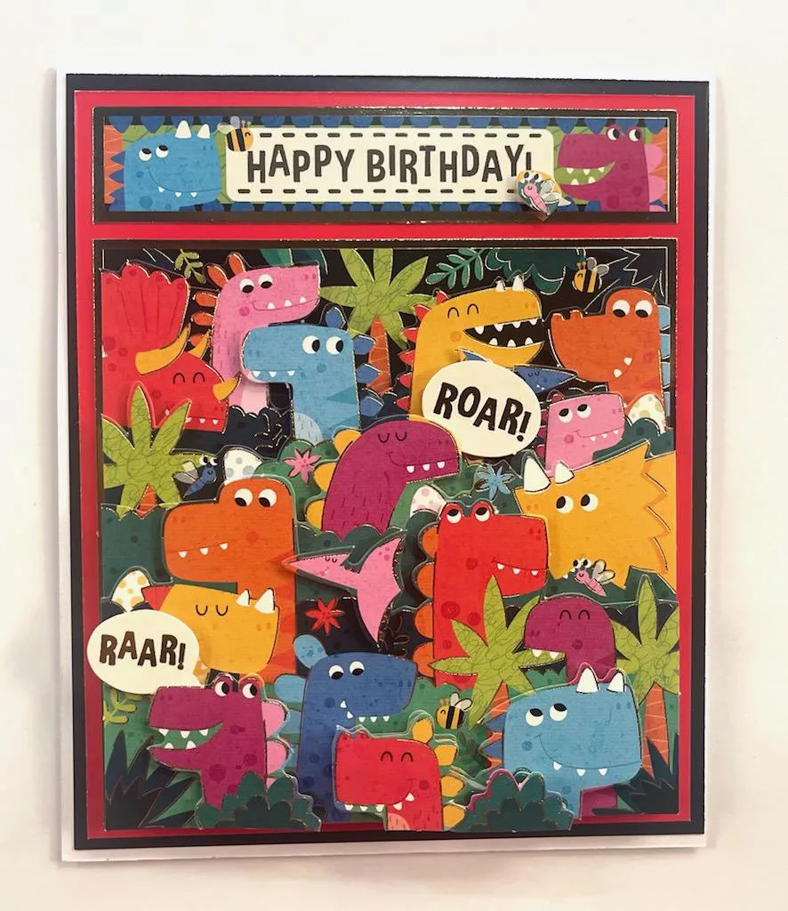 Cut 12"x5" white cardstock then score at 6” and fold for the card base. Glue the You’re Dino-Mite base layer and the Happy Birthday die-cut to 4 5/8”x5.5” red Adorable Scorable. Mat on black Adorable Scorable with 1/8” borders and glue to the card front. Foam tape the dinosaurs from the "Dino Mite" Deco-Large sheet onto the matching art as shown but do not use the piece at the bottom left (will use it inside). Foam tape the “ROAR!” and “RAAR!” die-cuts as you like.