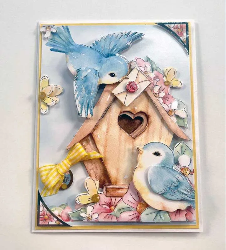 Card Inside: Cut 5”x6.5” of the printed Adorable Scorable (used on the front) and glue on the card inside. Foam tape the bird from the Deco-Large sheet at the bottom right. Glue the "New Home" topper at the top and foam tape the heart and flowers as shown. Zot™️ a knotted yellow ribbon above the heart. Place Diamond Sparkles as shown.