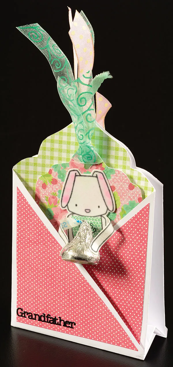 Chalk the ears and nose. Stamp the rabbit on a piece of scratch paper. Cut out the tummy to use as a pattern. Cut two tummies from Penelope green paper. Stamp “Hugs & Kisses” on each tummy. Glue in place on each rabbit. Zot™ the two arms on the back. Bring around to the front, and glue the kiss in the arms. Glue the rabbit to the tag near the top. Insert into the pocket with the arms outside the pocket.