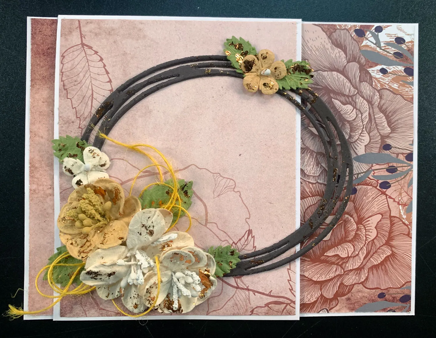 Cut 3 7/8"x4 7/8" Vintage Roses rose illustrations paper with flowers in the lower left corner. Glue it centered on the front flap. Die cut three oval wreaths from the dark brown cardstock, then stack and glue them together.