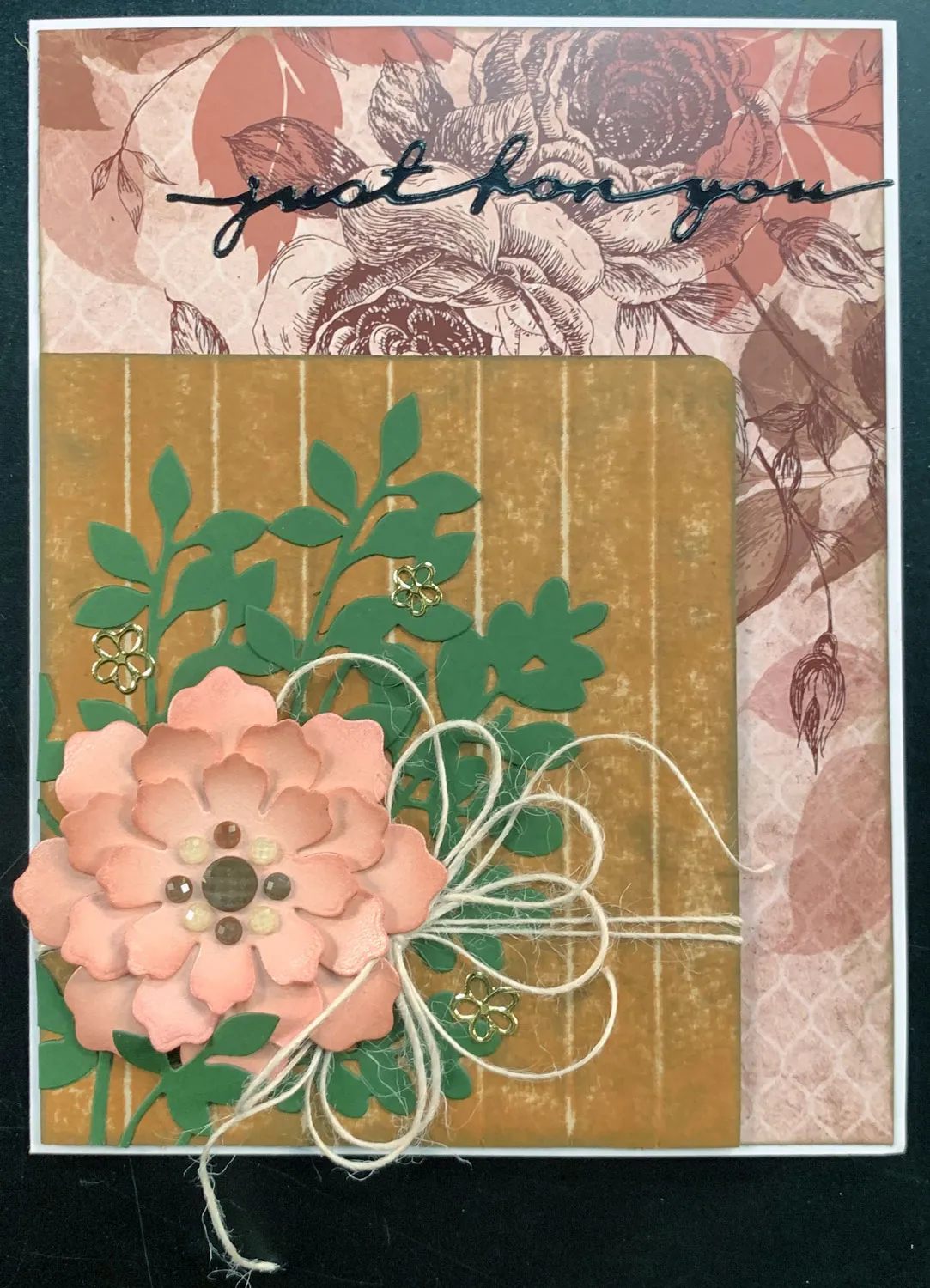 For the card front: Place the card with the fold on the left. Cut 4 7/8"x6 3/8" Vintage Roses corner design paper with the roses in the upper right corner. Ink the edges with Seal Brown, then glue the paper centered on the front.