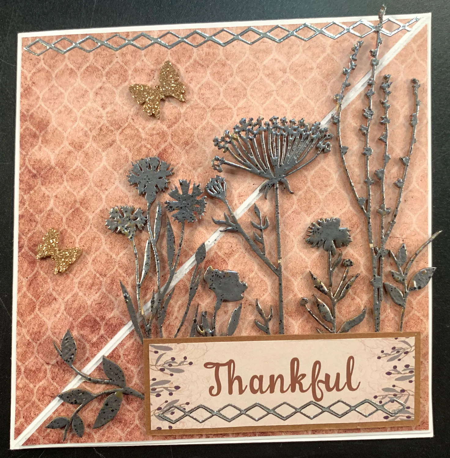 Remove the chipboard flowers shown from the base. Press each onto the embossing ink pad to completely coat it with ink. Cover each with the Iron Age embossing powder, tap off the excess, and heat the remainder to melt it. Emboss two chipboard butterflies with Copper Tinsel powder.