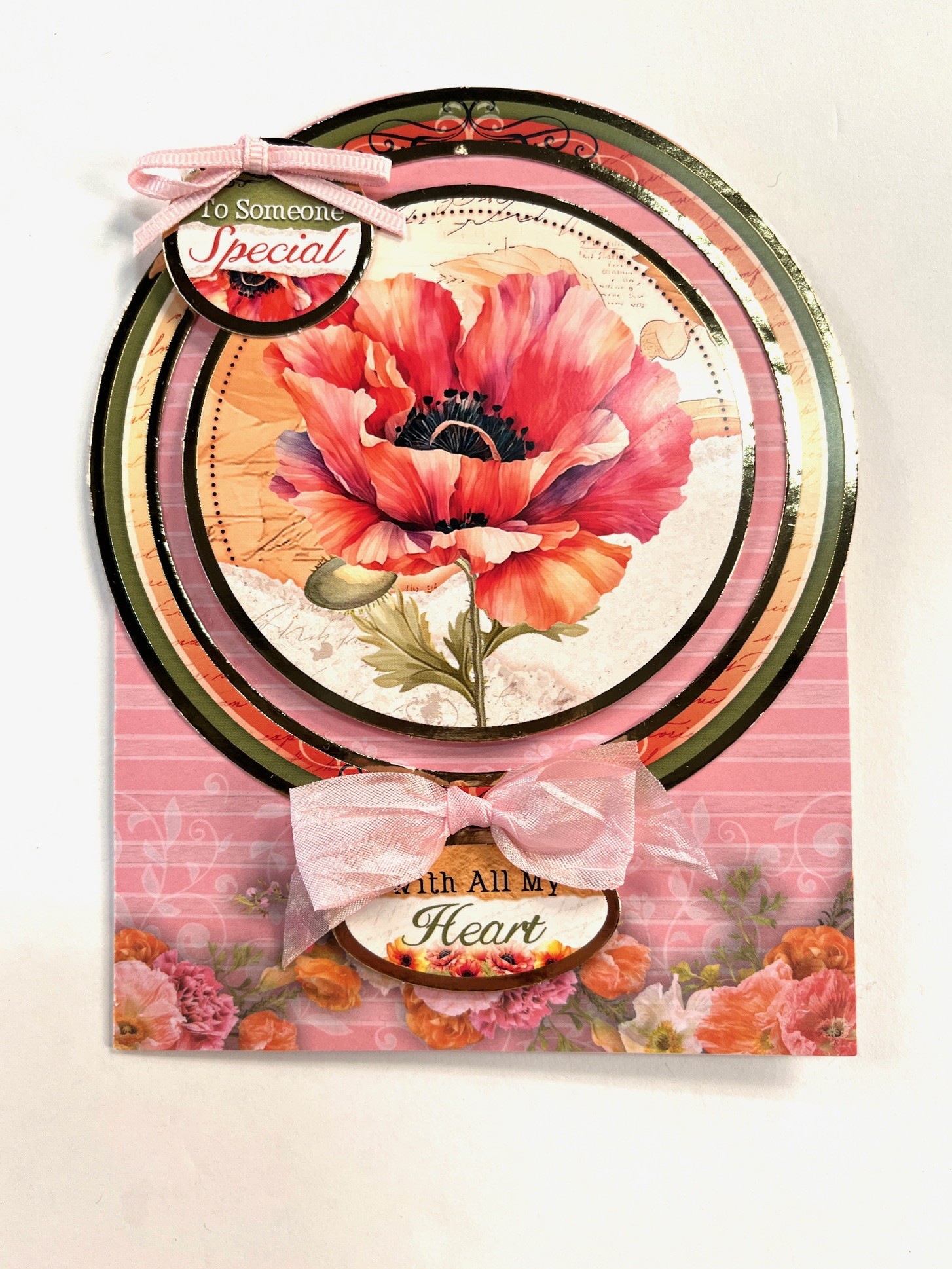 Separate large Poppy Topper from the “Precious Poppies” collection and remove the center ring. Tape the outer Topper ring at the top of the card. Foam tape the inner poppy in the center. Foam tape “To Someone Special” on the left and tape the right onto the poppy. Make and Zot™️ a 1 1/2” bow from the Light Pink Ribbon Set and place above this sentiment. Foam tape “With All My Heart” Topper at the bottom. Make and Zot™️ a 2” crepe bow from the Light Pink Ribbon Set and place between circle and sentiment.