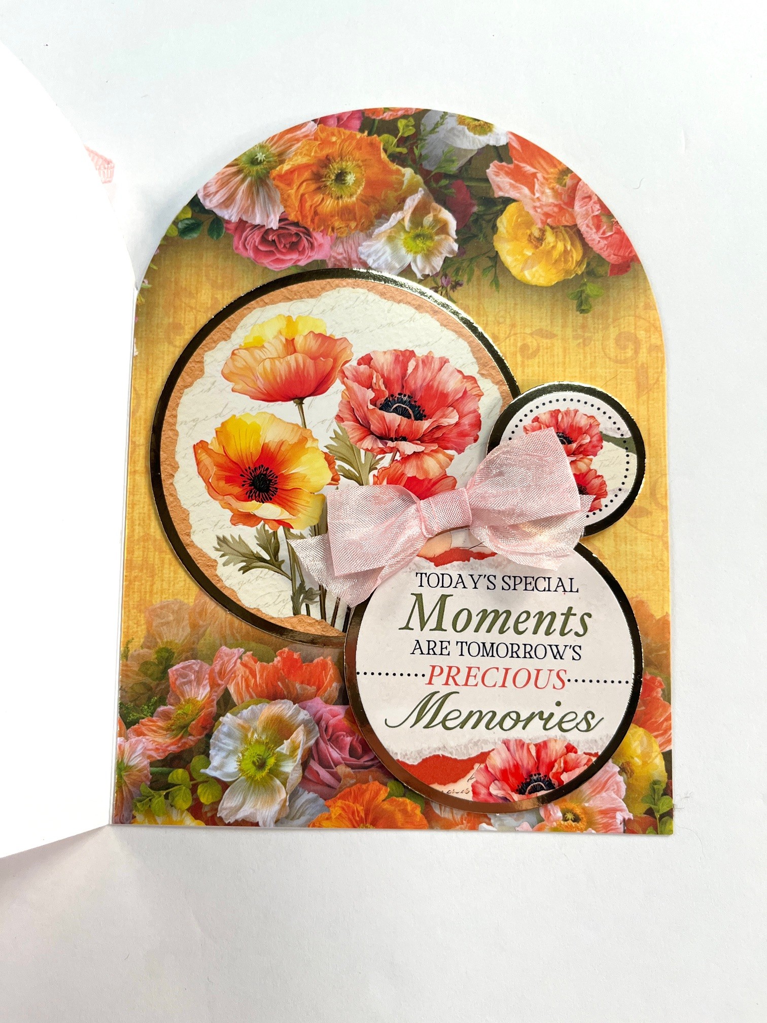 Card inside: Cover inside with tape, Place poppy cardstock on top flush to fold and one side, turn over and trim off the excess. Tape large poppy Topper 1/4” from the fold and 1 1/2” from the bottom. Foam Tape “Todays Special Moments Are Tomorrow’s Precious Memories” 1/4” from the bottom and ¼” from the right. Add a double layer of foam tape to the small poppies Topper and place as shown. Make and Zot™️ a 2” bow from the light Pink Ribbon Set and attach between the three Toppers.
