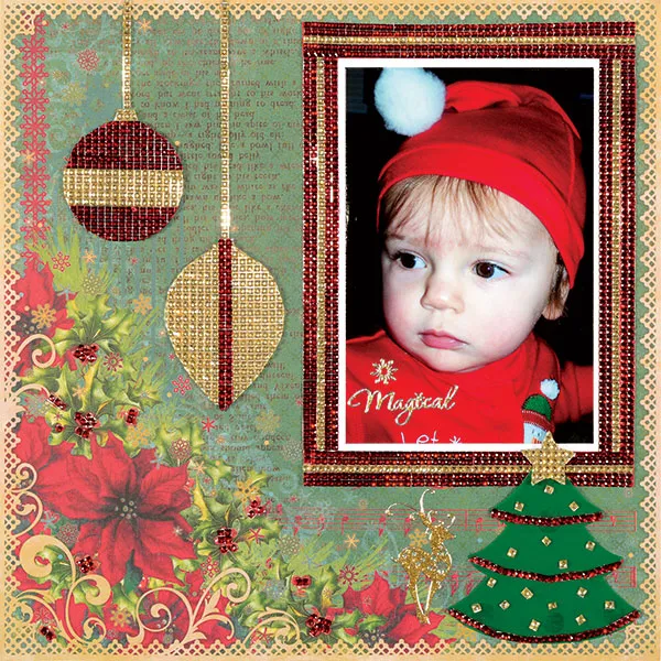Cut a single line of red rhinestones. Line each section of the Christmas Tree Mini template. Cut single gold rhinestones to decorate the tree. Cover a star with gold rhinestones and cut out the shape. Zot on top of the tree. Glue to the bottom right under the photo, with the star overlapping the photo.