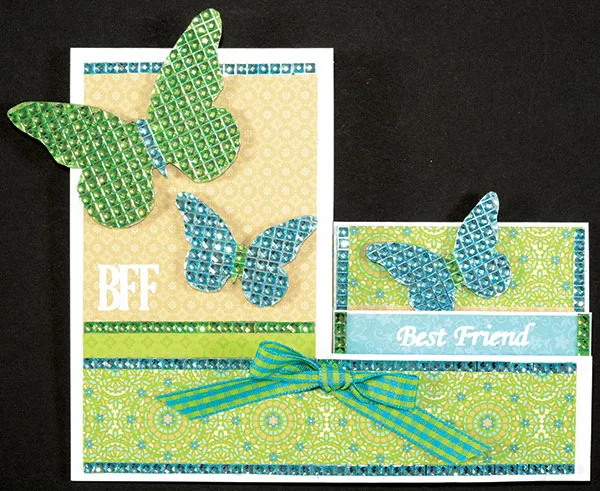 Place Family & Friends Dazzles™ “BFF” on the left side of the card near the butterflies. Place “Best Friend” on the front riser, centered near the top. Use the 3/8” wide lime/blue gingham ribbon to tie a bow. Zot™ the bow near the center of the card front as shown.